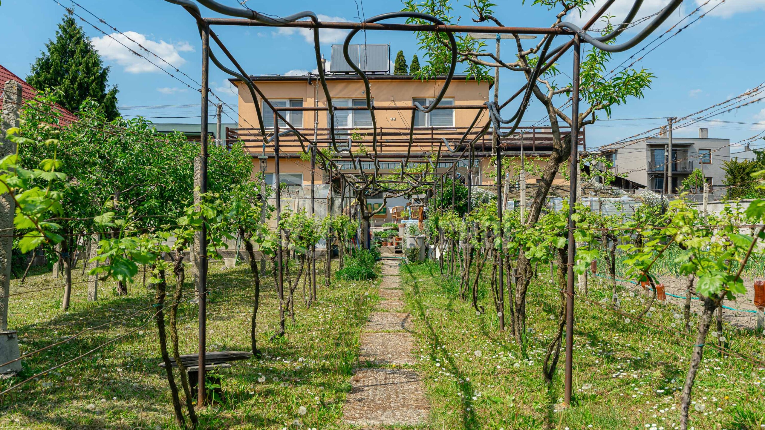 Nachádza sa na veľkorysom pozemku o výmere 956 m² s krásnou súkromnou záhradou (491 m²), bazénom, viničom a vínnou pivnicou. Okrem komfortného bývania ponúka aj široké možnosti investície a budúcej prestavby.