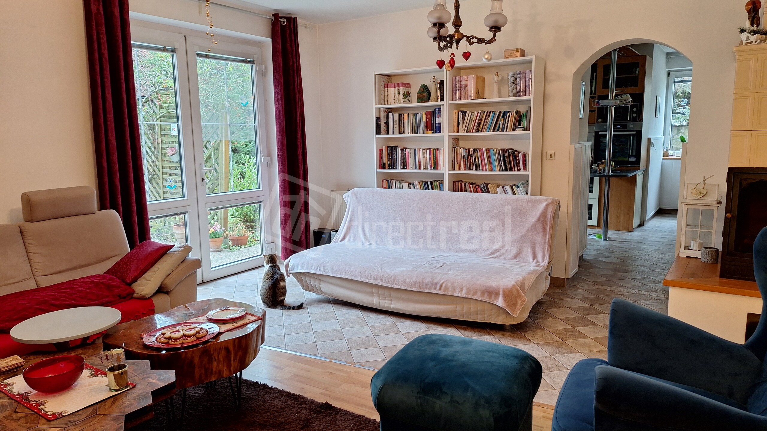 Z obývačky sú dvojkrídlové dvere na terasu, ktorá je orientovaná na južnú stranu domu a jedno okno z obývačky je na východ.