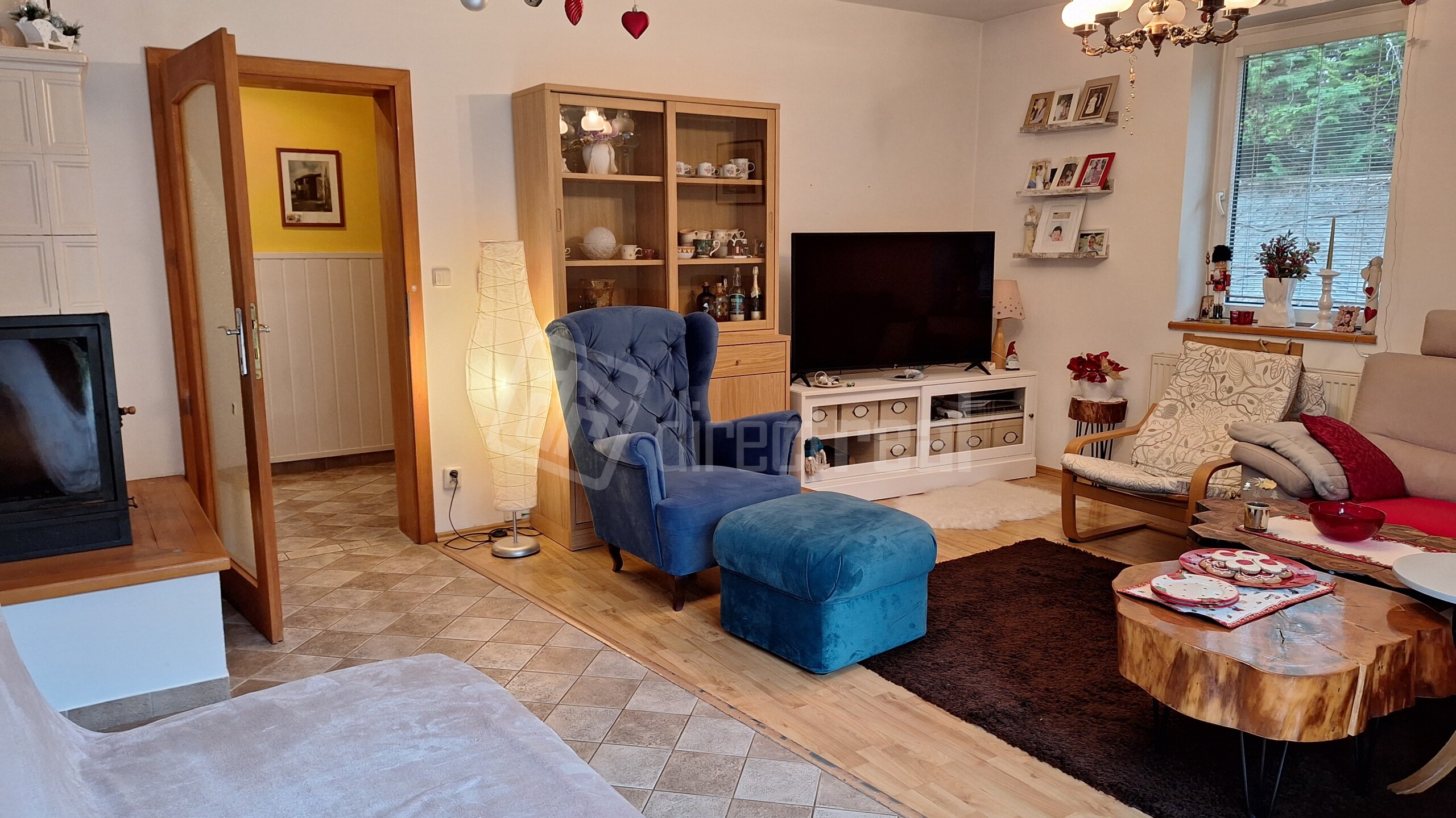 V obývačke sa nachádza krb na tuhé palivo.