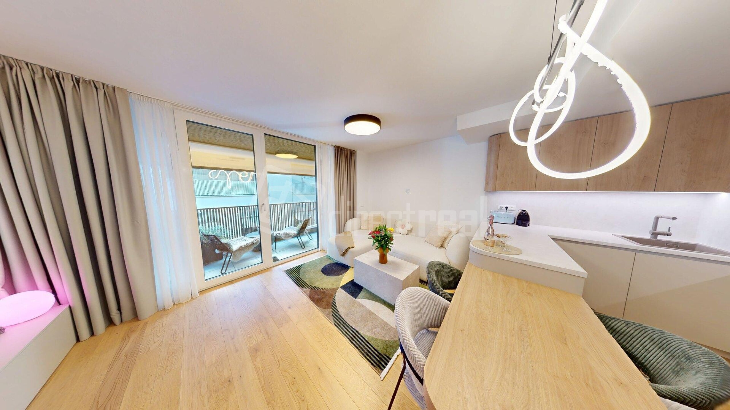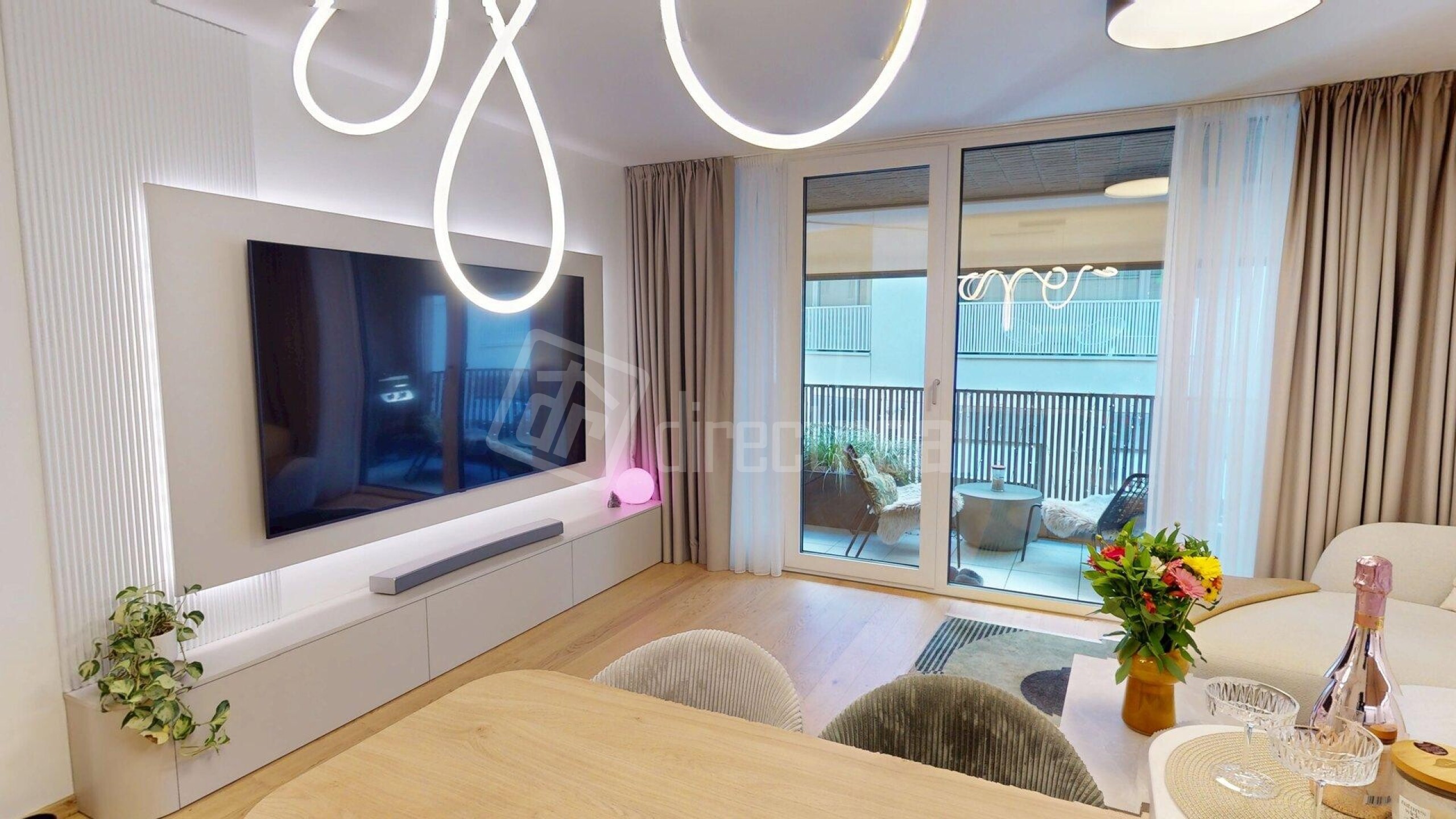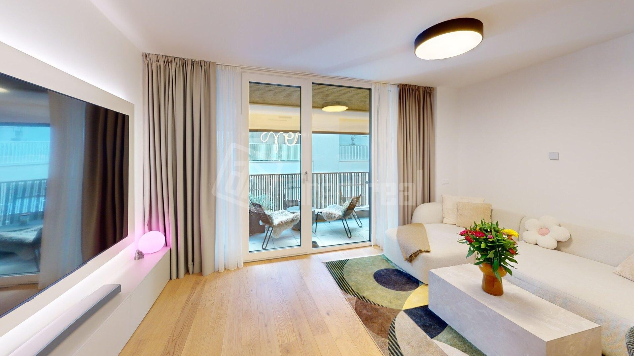 Podlahy v celom byte sú drevené s výnimkou kúpeľne a WC, kde je položená dlažba. Na oknách v byte sú blackout závesy. Kuchynská linka má zabudované spotrebiče a k dispozícii je i kuchynské náradie a náčinie. Celý byt je orientovaný na 2 svetové strany SV a SZ. V obývacej izbe je TV s impozantnou uhlopriečkou 217cm. Optimálnu vlhkosť v byte a kvalitu vzduchu v interieri vám zabezpečí rekuperácia. Lódžia je miesto pre oddych i v letných horúcich mesiacoch, pretože poskytuje príjemný i dostatok súkromia vdaka screen rolete. The floors throughout the apartment are wooden, except for the bathroom and toilet, where tiles are laid. The windows in the apartment have blackout curtains. The kitchen unit includes built-in appliances and is equipped with kitchen utensils and tools. The entire apartment faces two directions: northeast and northwest. In the living room, there is a TV with an impressive 217 cm diagonal. Optimal humidity and indoor air quality are ensured by the heat recovery ventilation system. The loggia is a place for relaxation even during the hot summer months, as it provides comfort and plenty of privacy thanks to the screen blind.