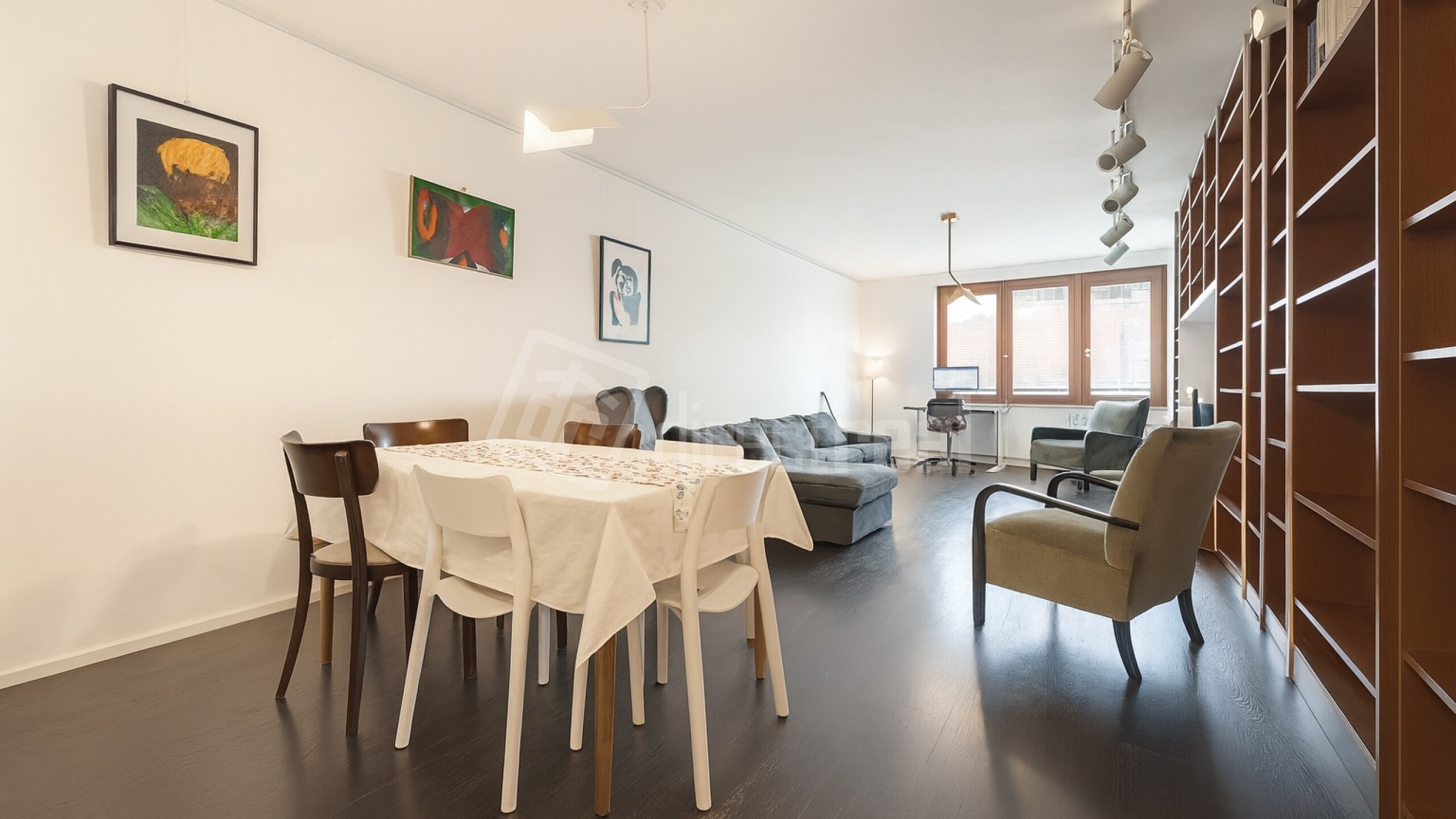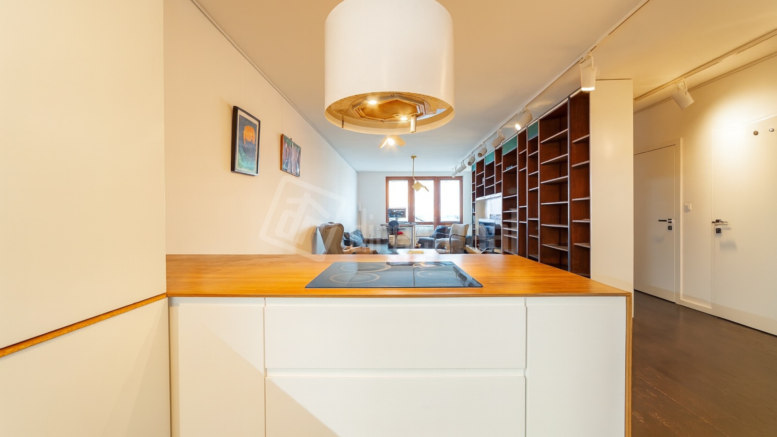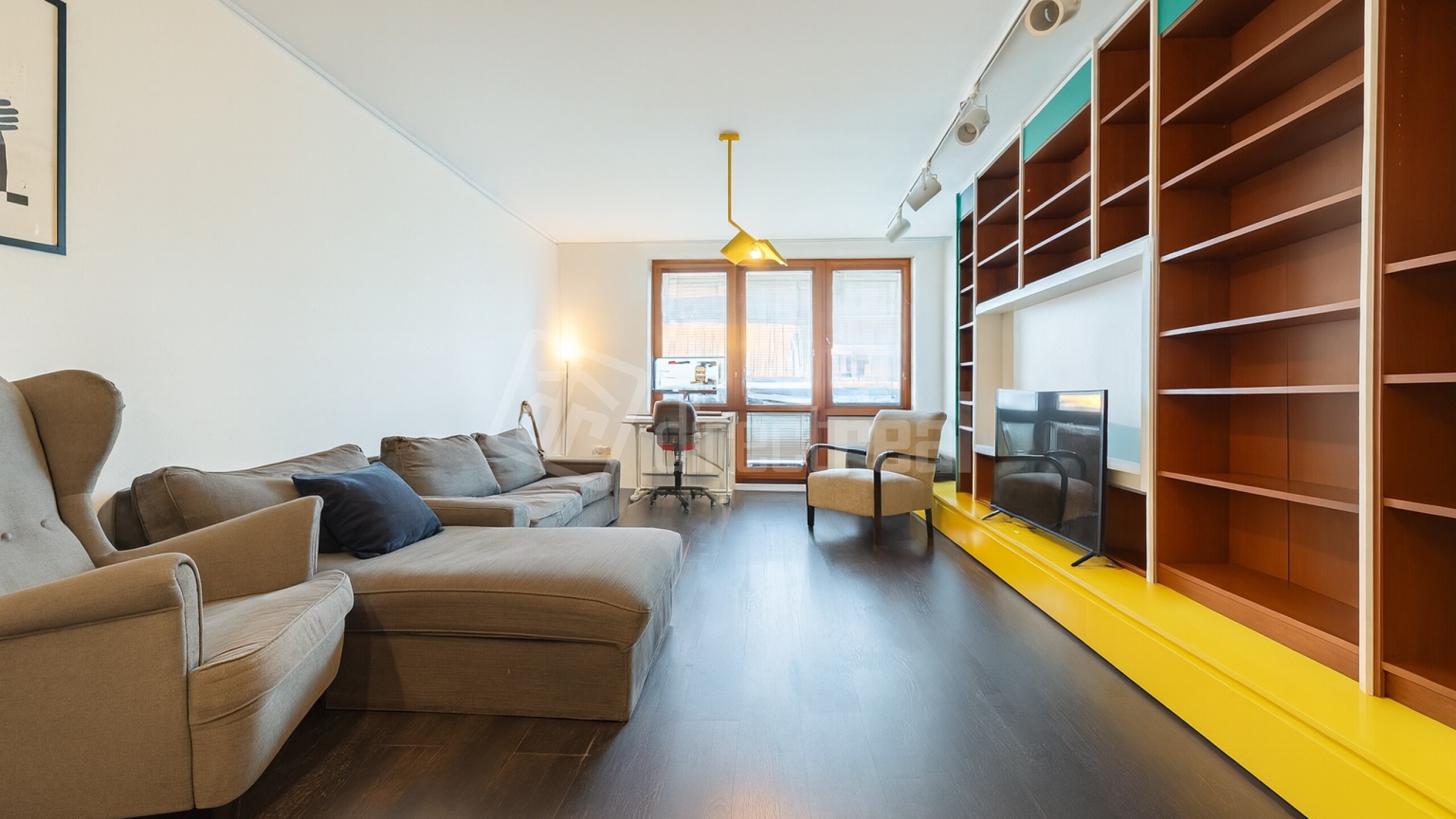 Priestranná obývačka plynule spája oddychovú zónu, pracovný kút aj knižnicu – ak hľadáte priestor na tvorbu, sústredenie aj večerné posedenie. Moderná kuchyňa so spotrebičmi a dizajnovým osvetlením dopĺňa celok, ktorý pôsobí premyslene, vzdušne a mimoriadne funkčne.