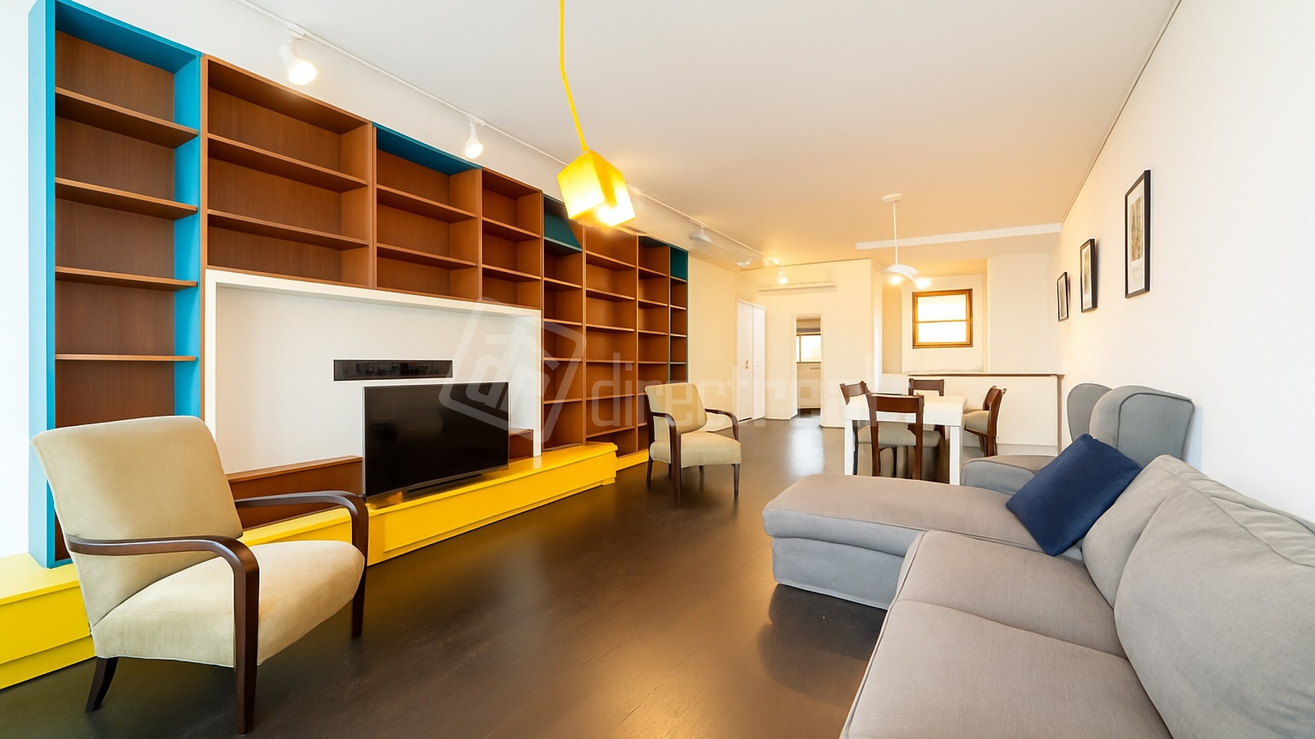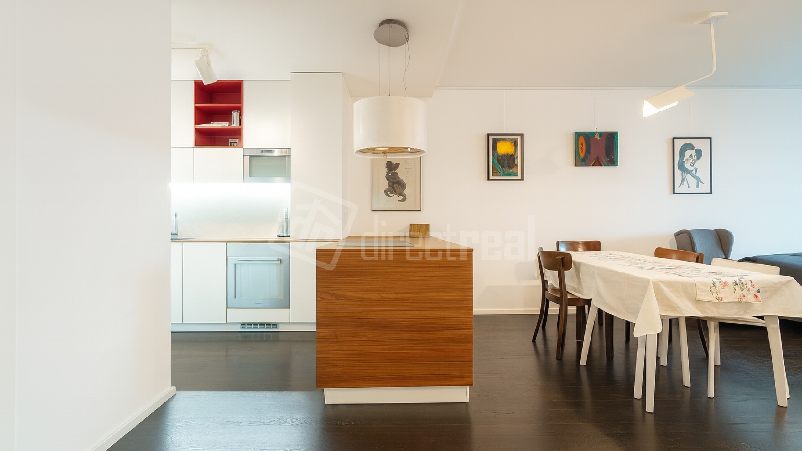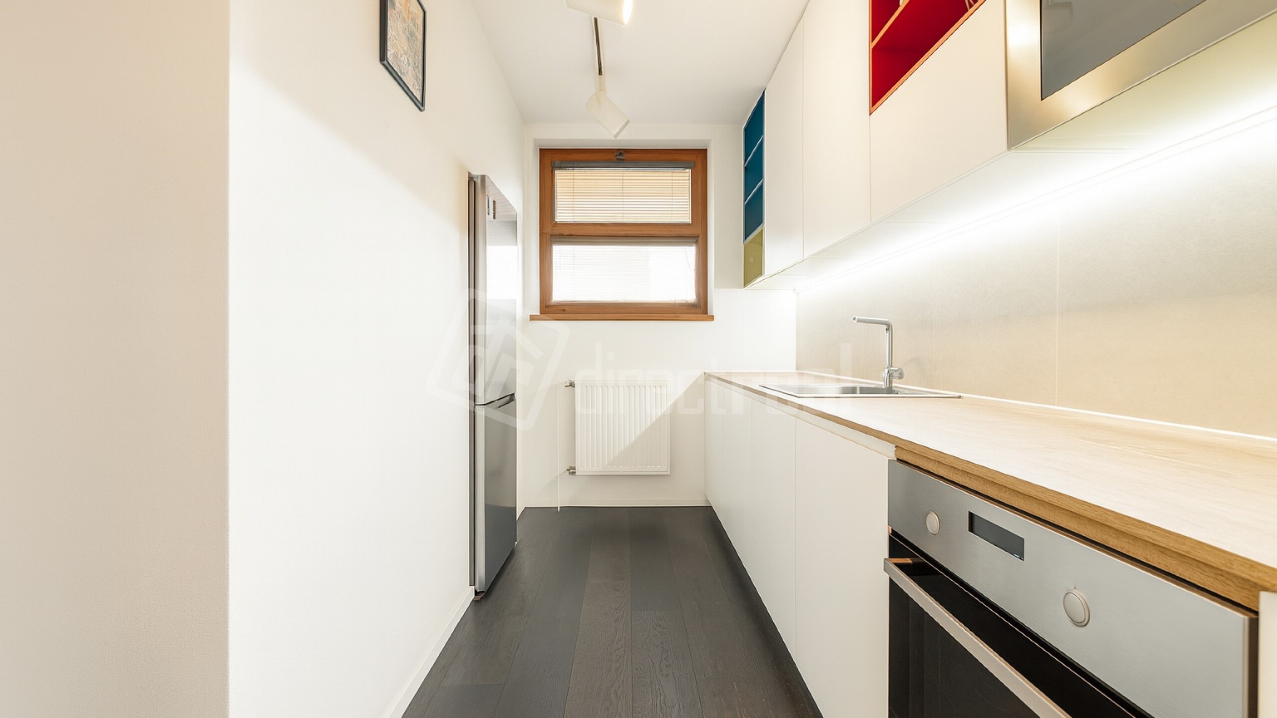 Priestranná obývačka plynule spája oddychovú zónu, pracovný kút aj knižnicu – ak hľadáte priestor na tvorbu, sústredenie aj večerné posedenie. Moderná kuchyňa so spotrebičmi a dizajnovým osvetlením dopĺňa celok, ktorý pôsobí premyslene, vzdušne a mimoriadne funkčne.