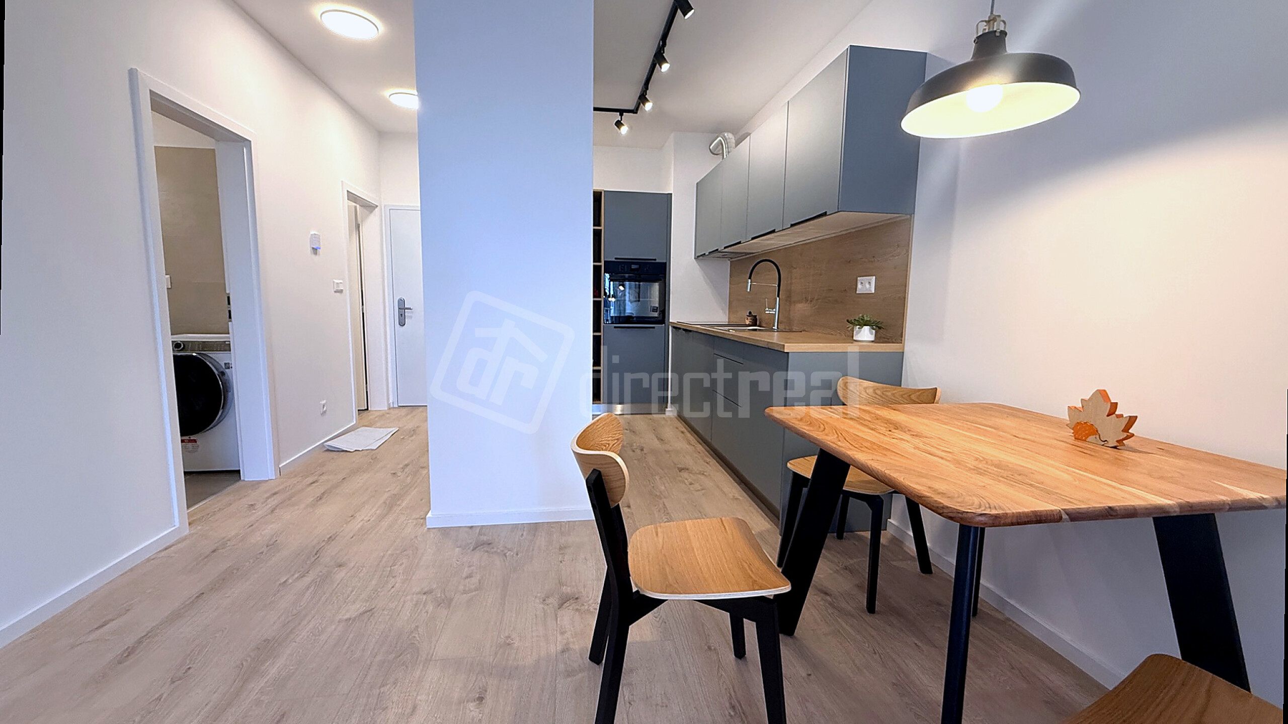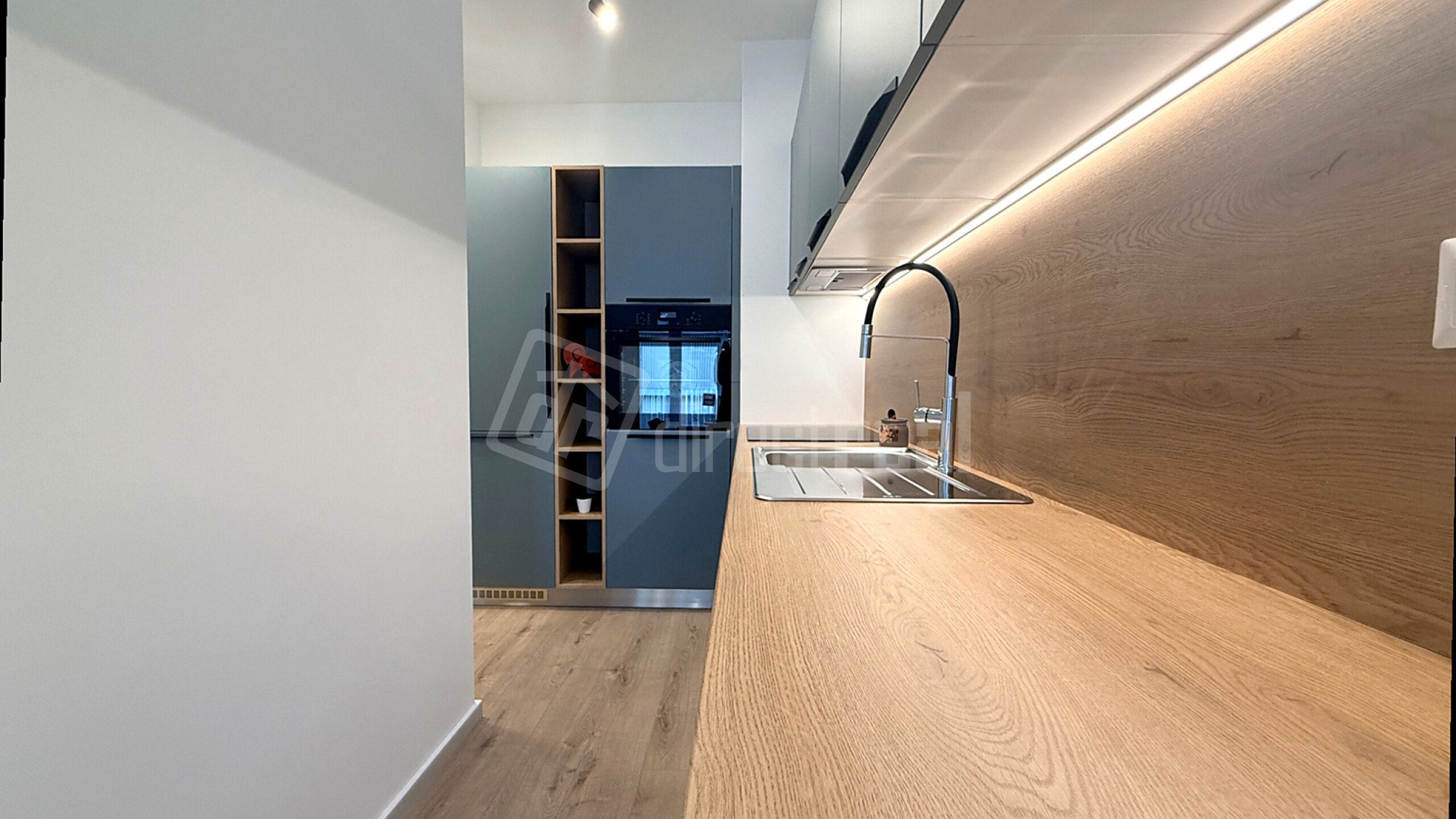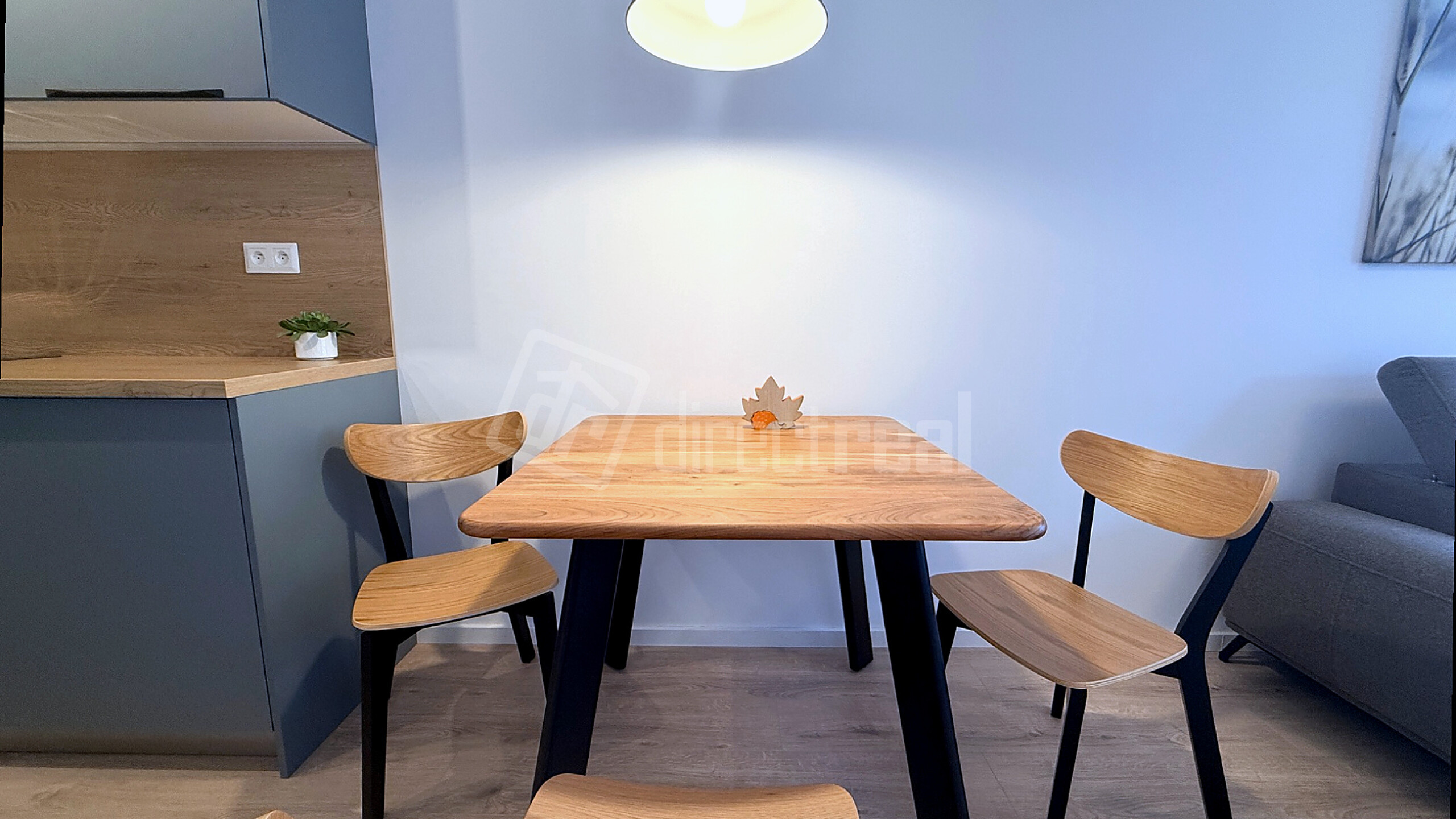 Interiér ladený v harmonických tónoch s drevenými dekormi a štýlovou sivo-modrou kuchyňou vytvára atmosféru, v ktorej sa budete cítiť výnimočne od prvého momentu.