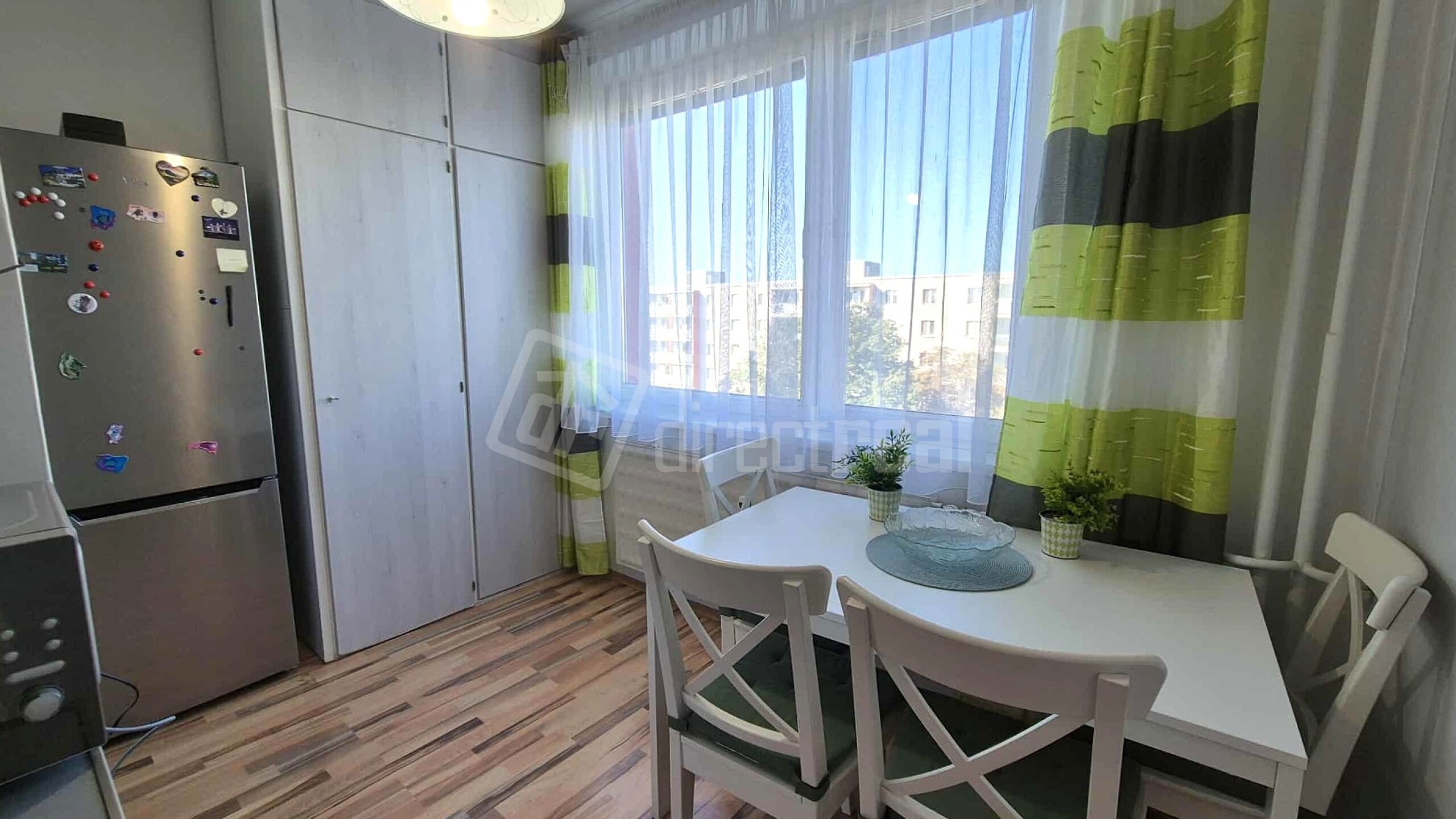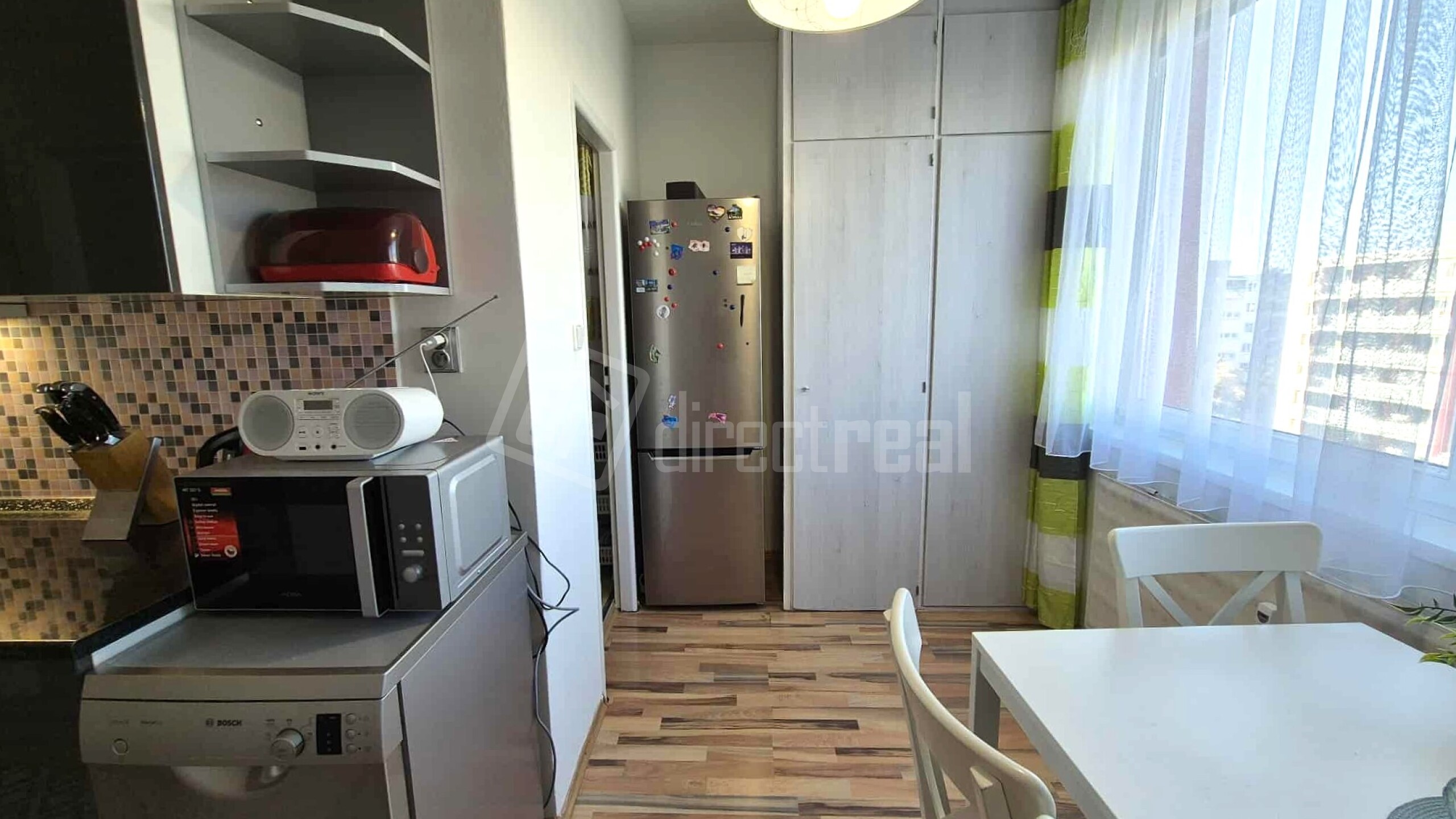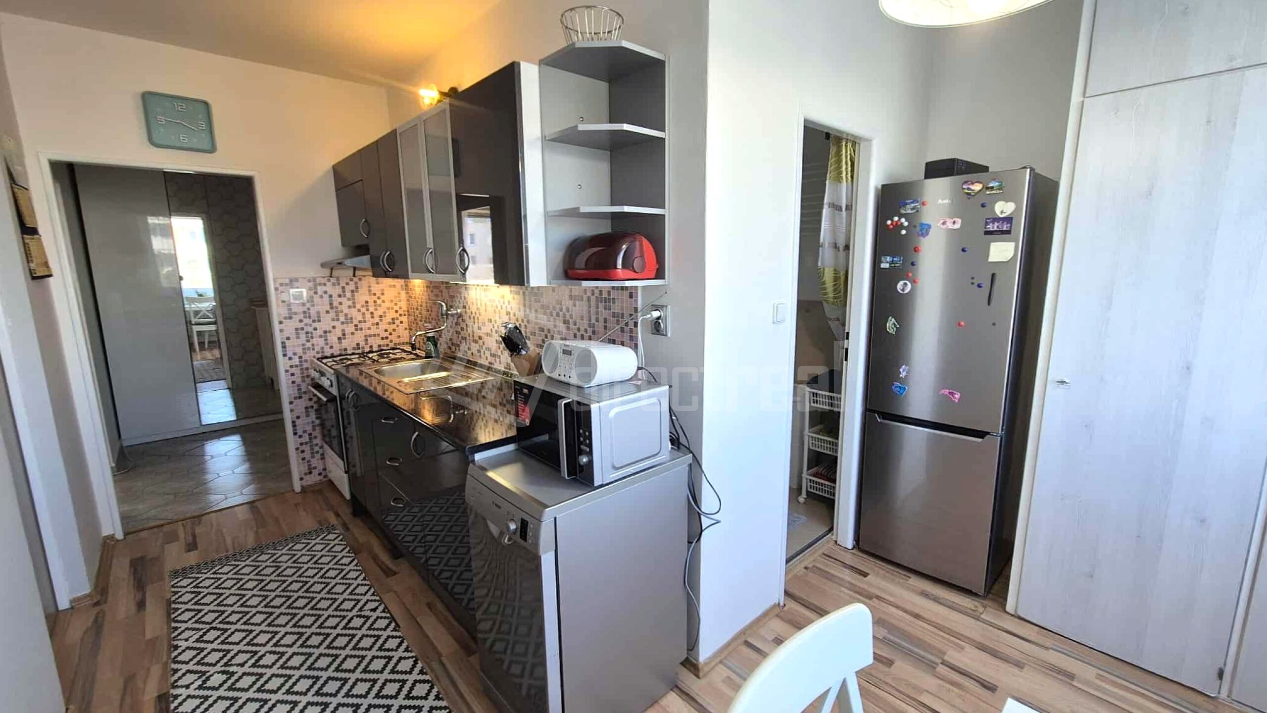 Kuchyňa je vybavená plynovým sporákom, elektrickou rúrou, mikrovlnnou rúrou, umývačkou riadu, chladničkou a mrazničkou. Jedálenský stôl so 4 stoličkami je umiestnený pri okne. Miesto tu má aj potravinová skriňa.