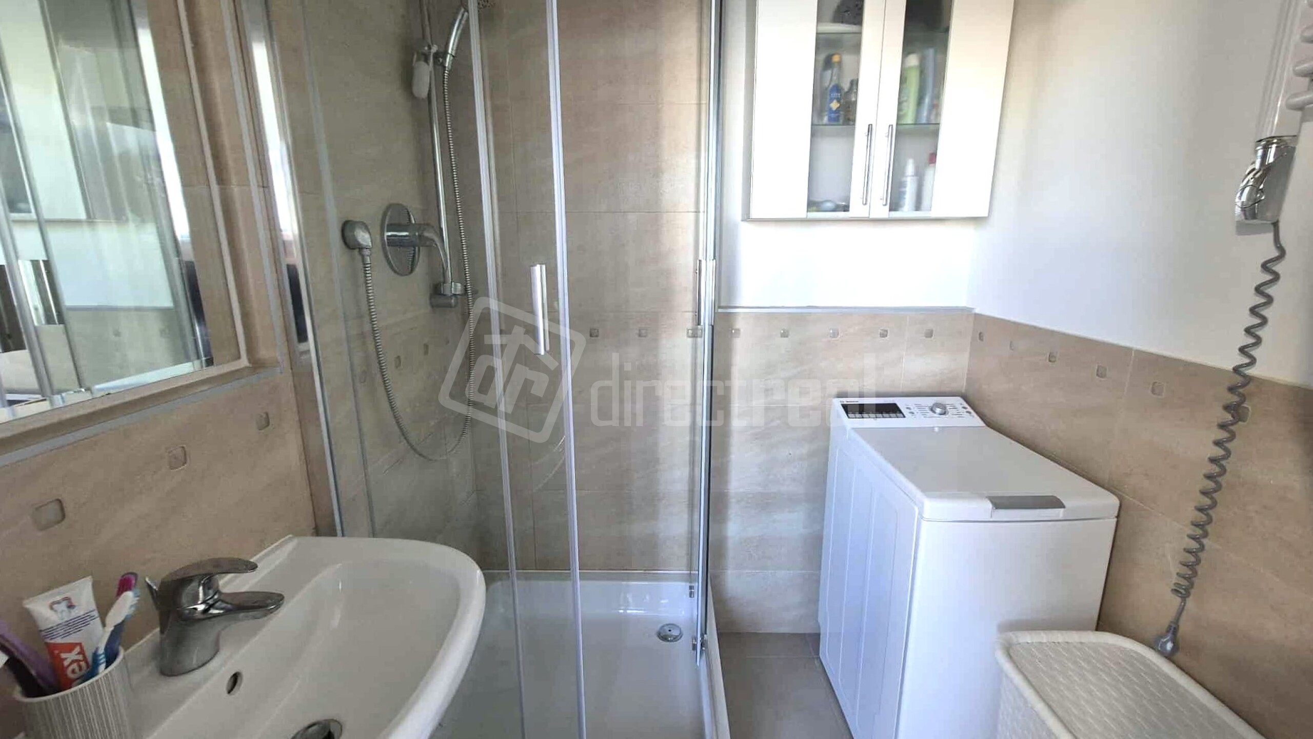 Kúpeľňa má vstup z kuchyne, je v nej sprchový kút a práčka. WC je samostatné.