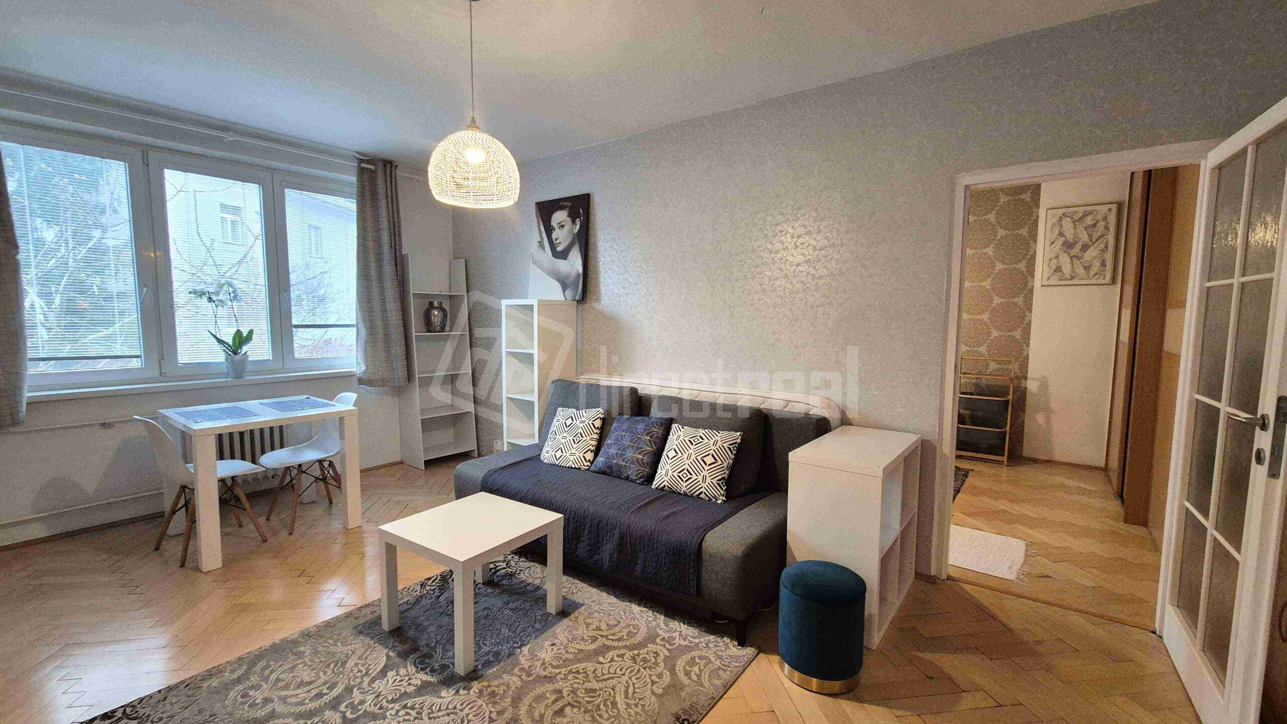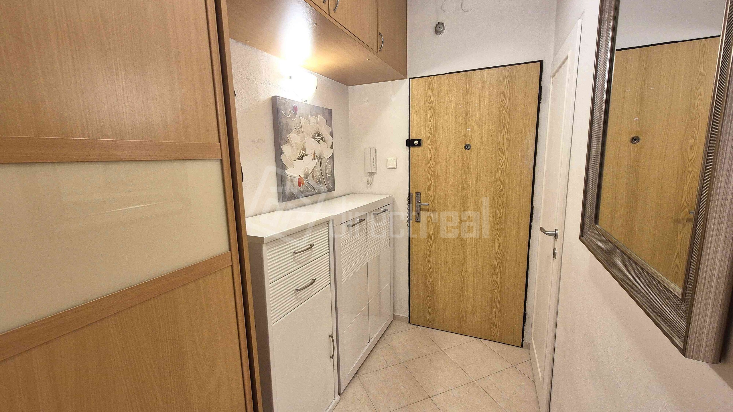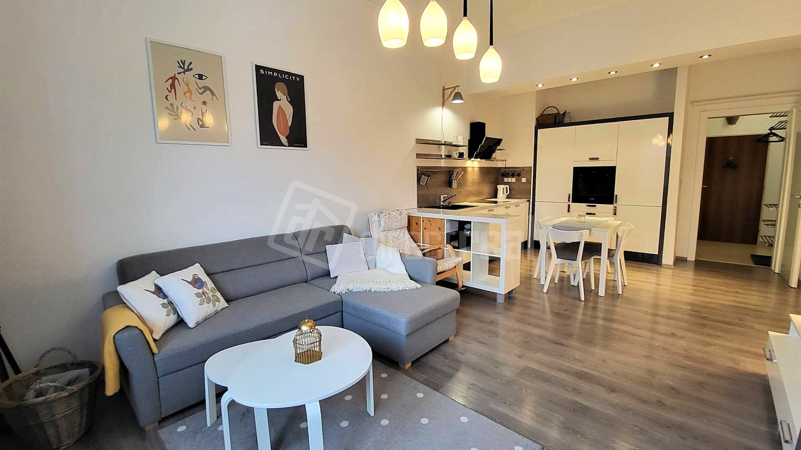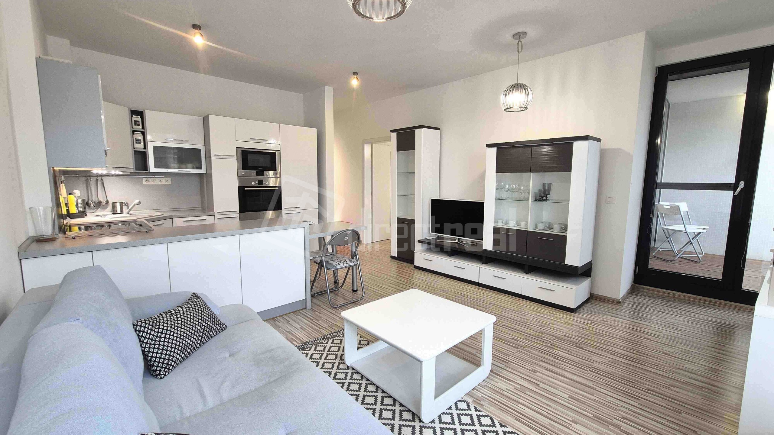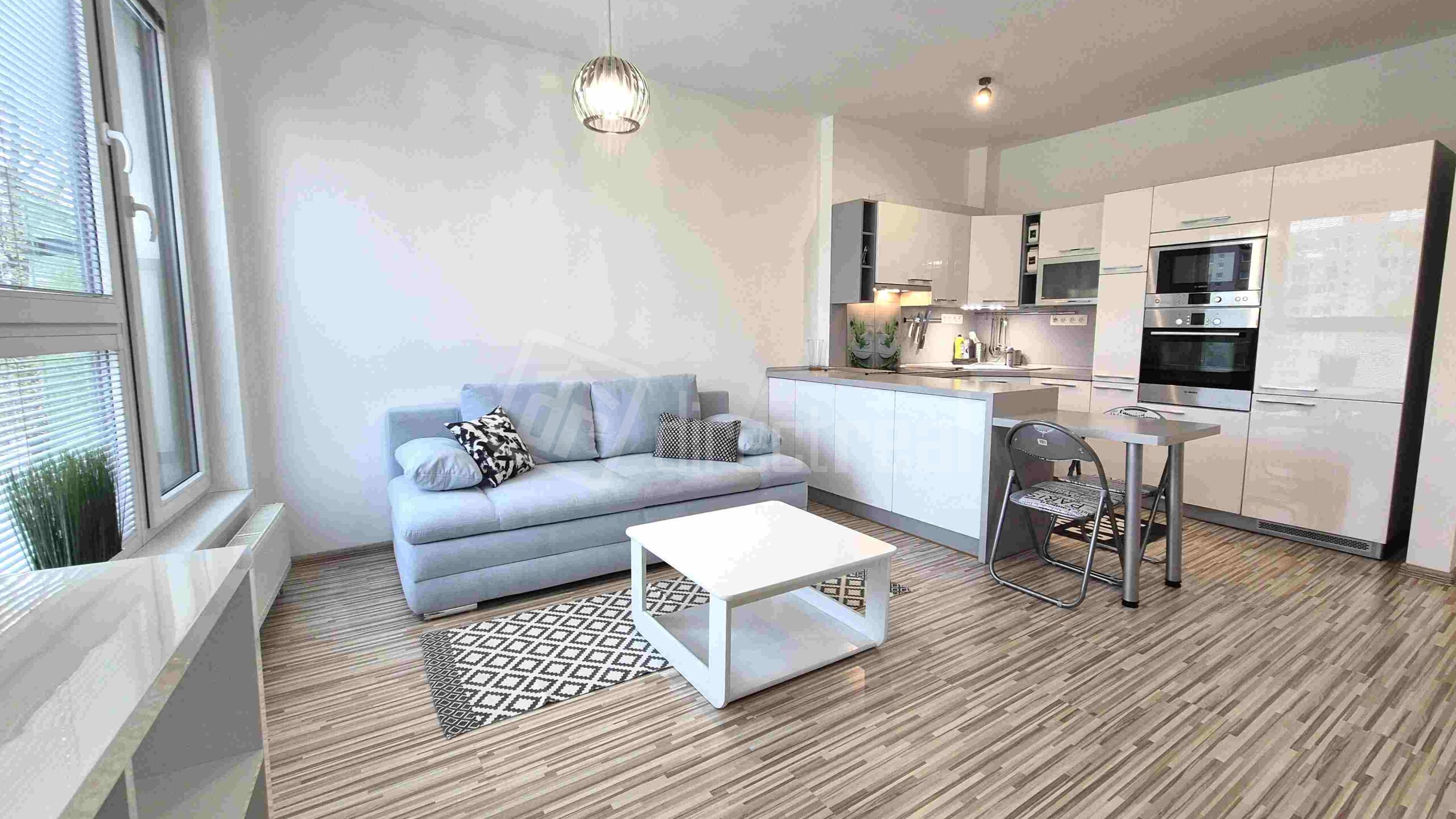 Vstup do bytu je cez bezpečnostné dvere do predsiene s úložným nábytkom. Z predsiene sa vchádza na samostatné WC a do kúpeľne so sprchovým kútom a práčkou. Obývačka je priestranná, vybavená rozkladacou sedačkou, jedálenským sedením a obývačkovým nábytkom. Prechádza sa z nej do kuchyne, vybavenej plynovou varnou doskou, elektrickou rúrou, mikrovlnnou rúrou, umývačkou riadu, chladničkou a mrazničkou. V spálni je manželská posteľ a vstavaná skriňa. Z miestnosti je vstup na loggiu.