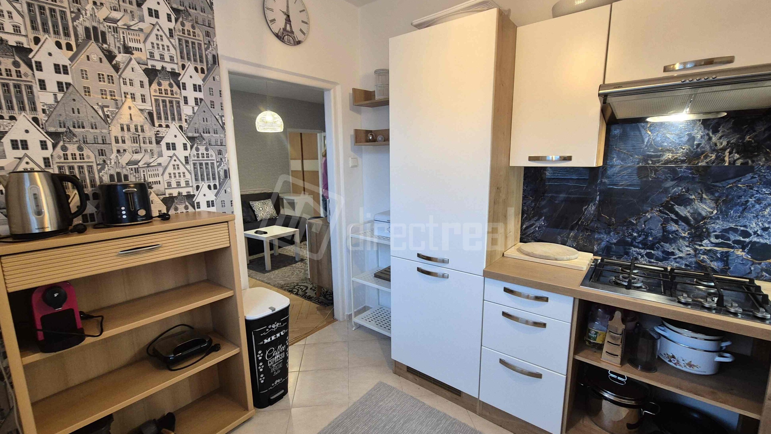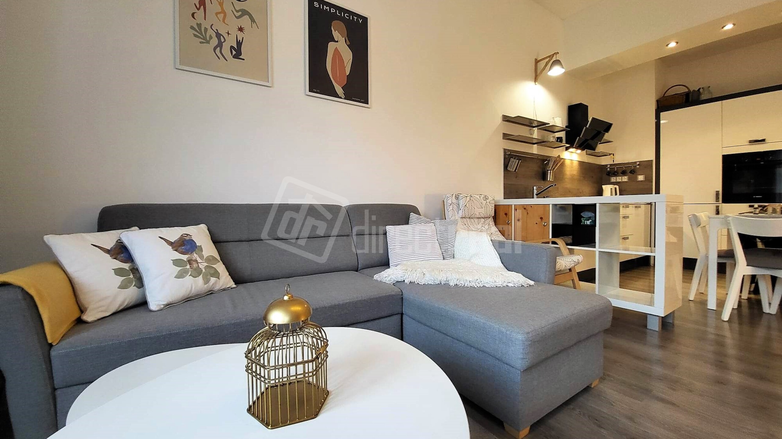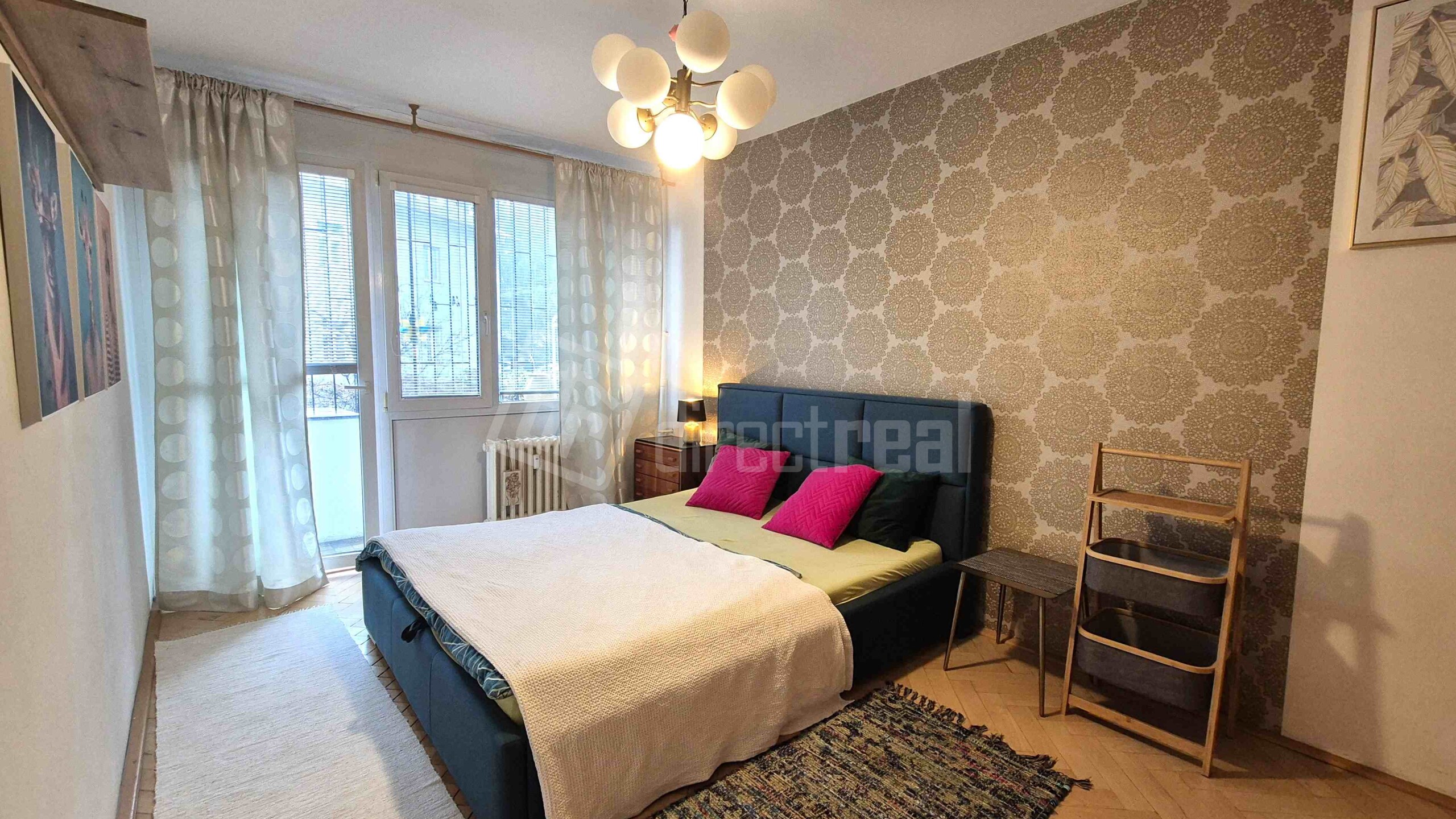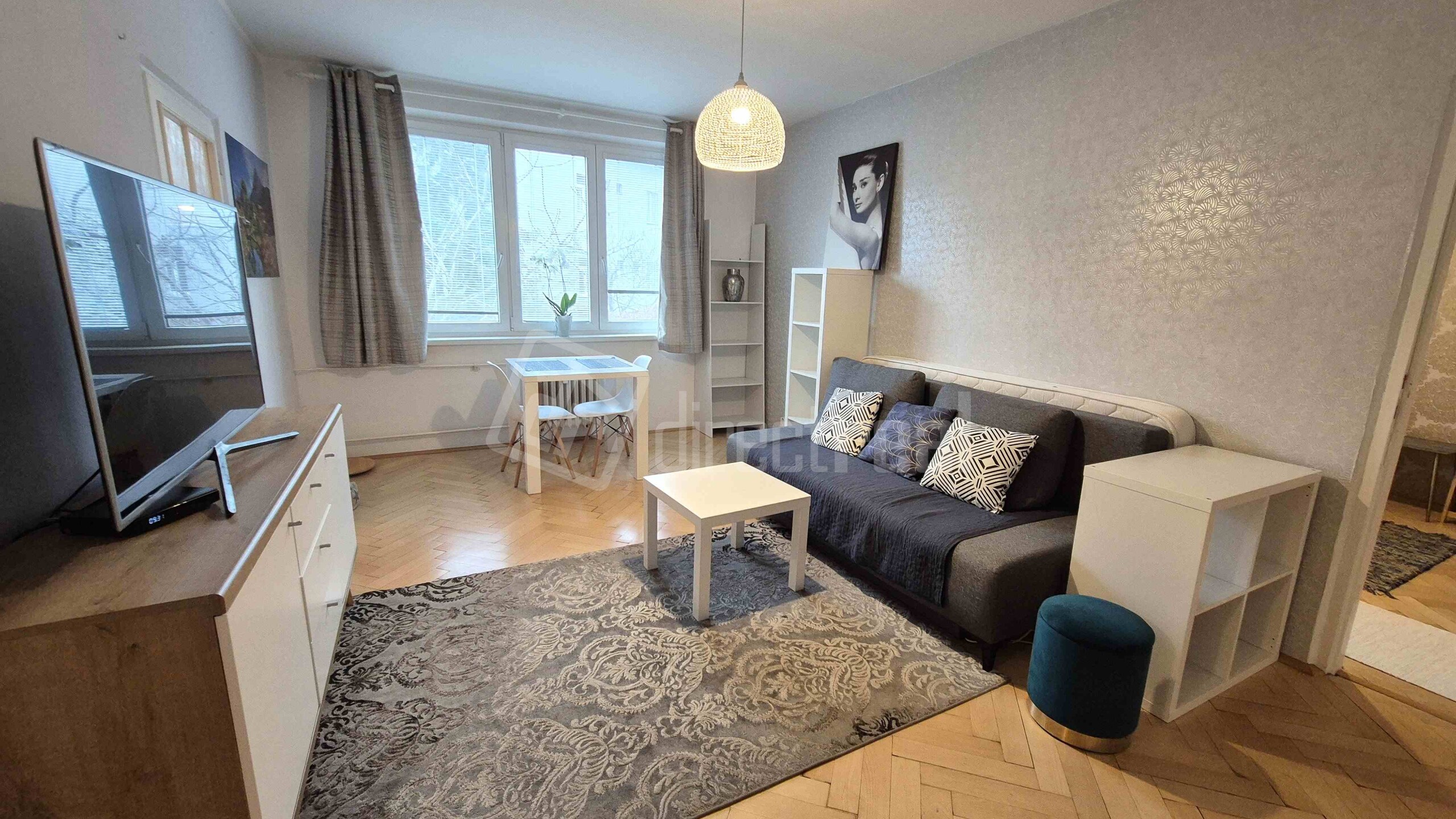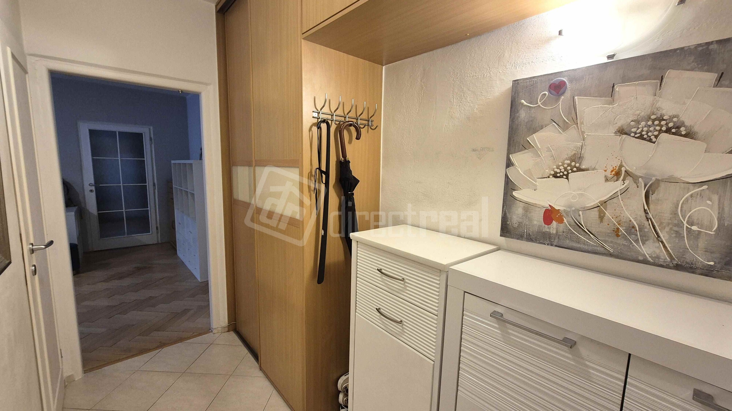 Vstup do bytu je cez bezpečnostné dvere do predsiene s úložným nábytkom. Z predsiene sa vchádza na samostatné WC a do kúpeľne so sprchovým kútom a práčkou. Obývačka je priestranná, vybavená rozkladacou sedačkou, jedálenským sedením a obývačkovým nábytkom. Prechádza sa z nej do kuchyne, vybavenej plynovou varnou doskou, elektrickou rúrou, mikrovlnnou rúrou, umývačkou riadu, chladničkou a mrazničkou. V spálni je manželská posteľ a vstavaná skriňa. Z miestnosti je vstup na loggiu.