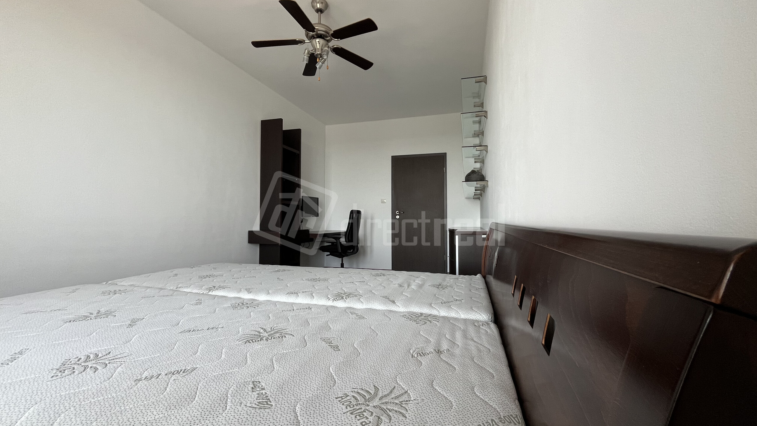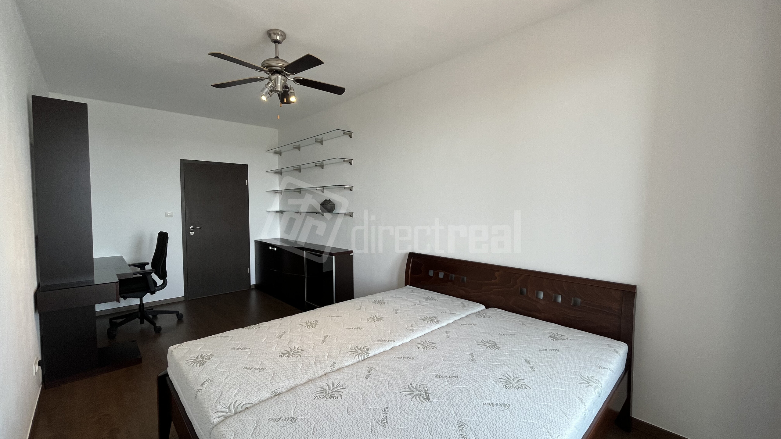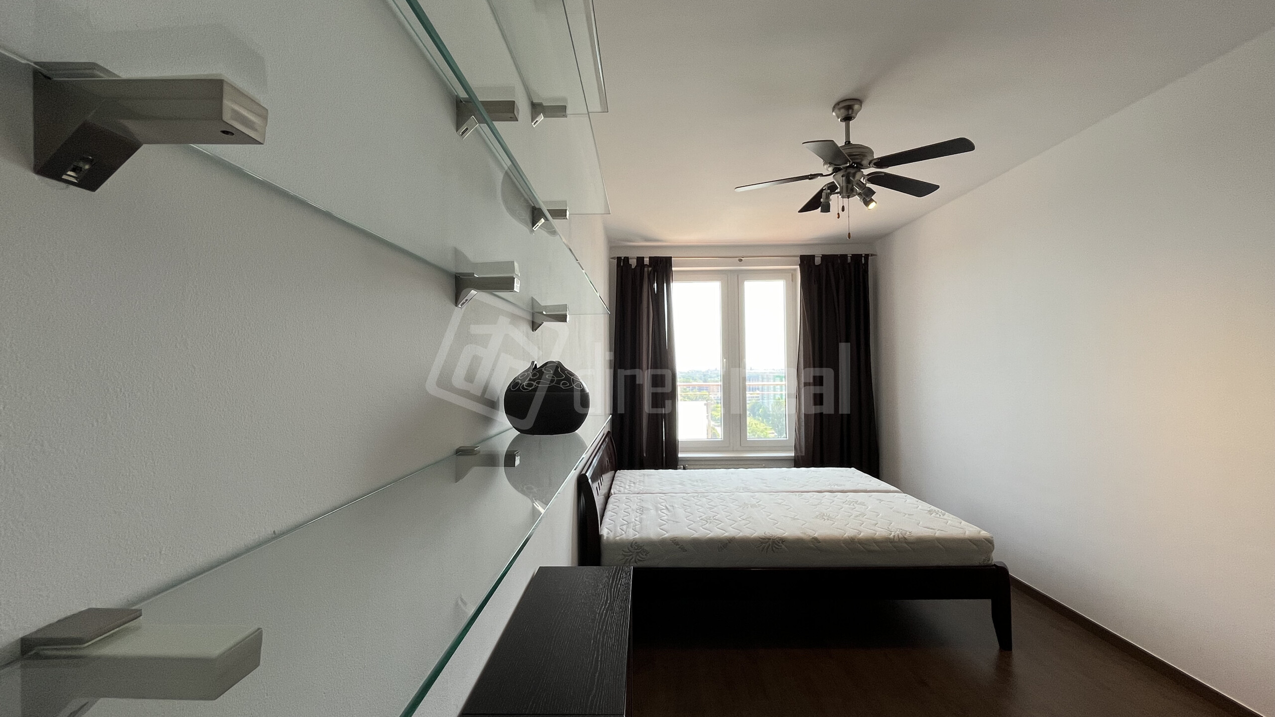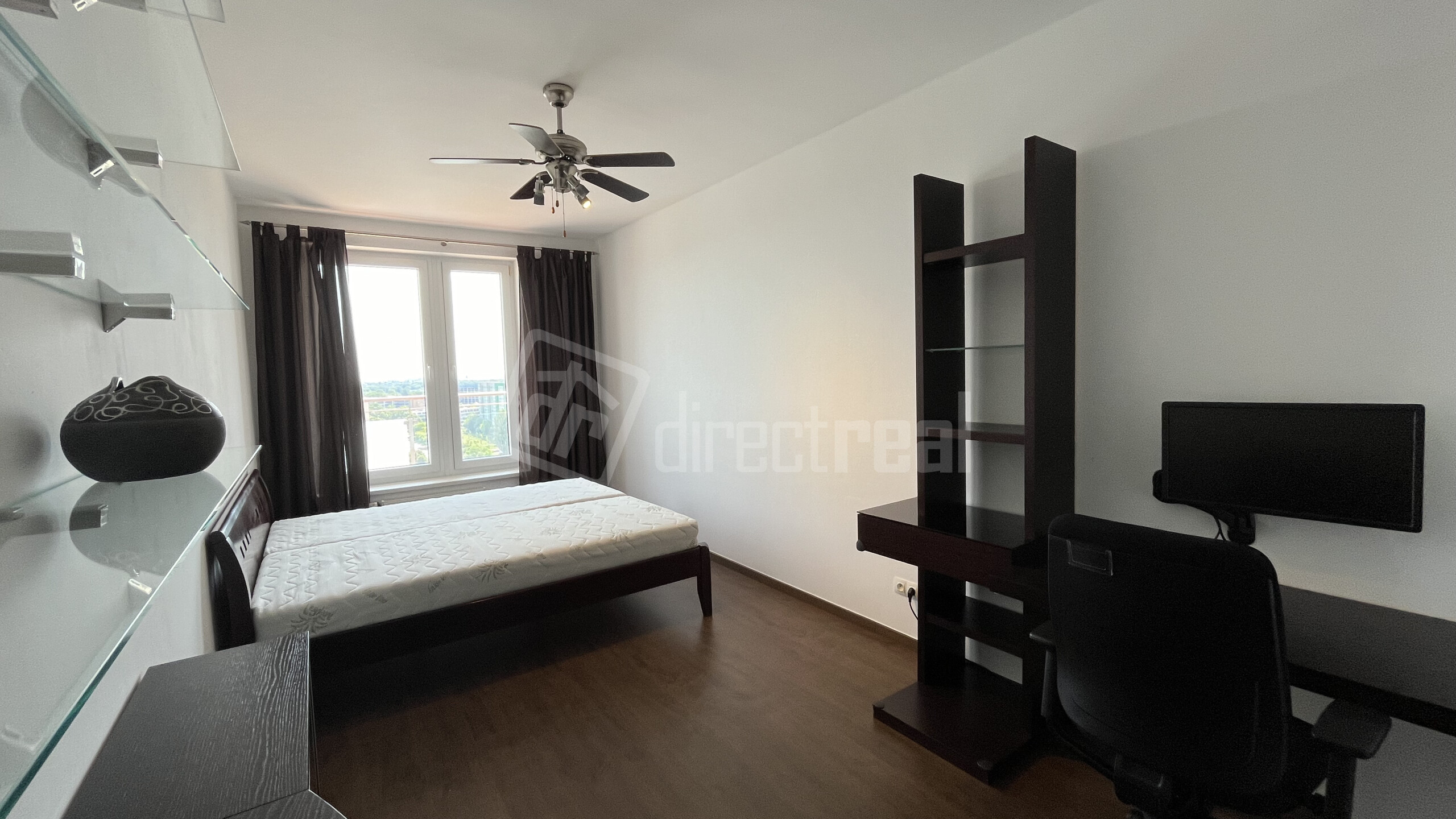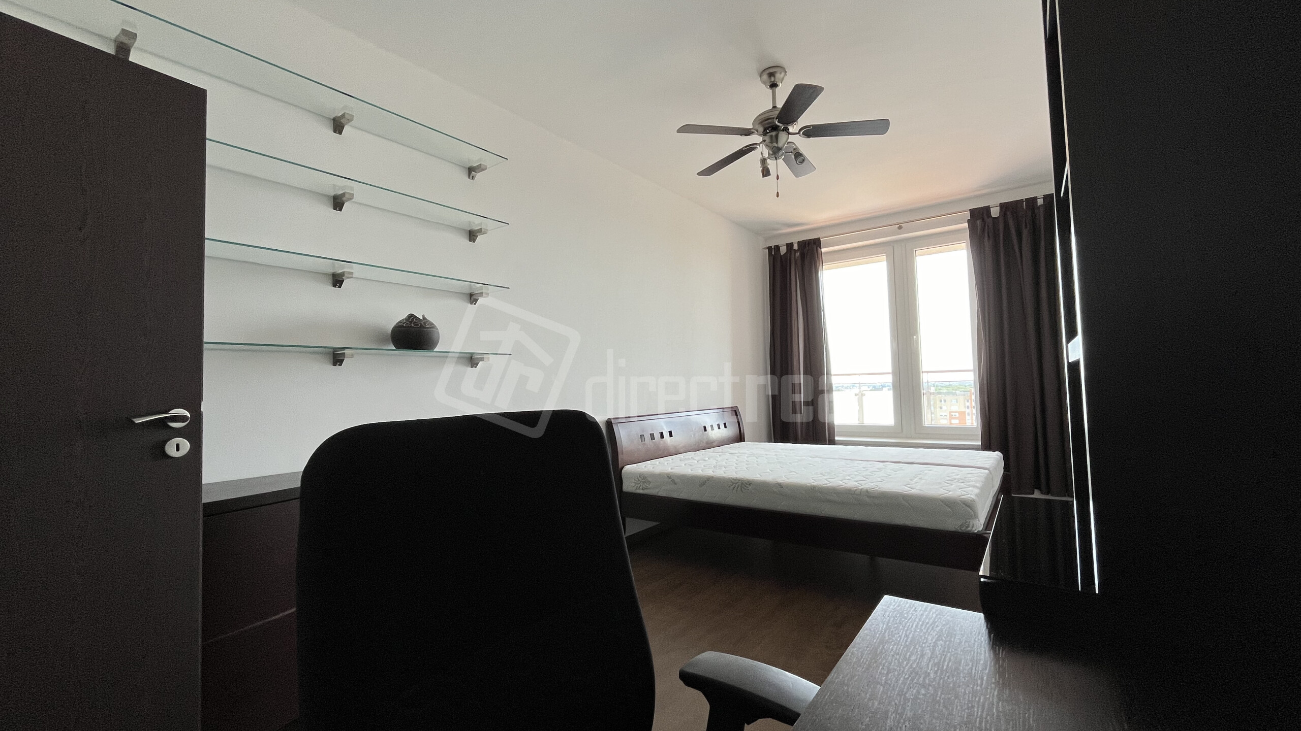 - Spálňa s výhľadom na loggiu – s klimatizáciou, posteľou (vrátane posteľnej bielizne, ktoré nie je na foto), skrinkami, policami, pracovným stolíkom, stoličkou a monitorom, stropným ventilátorom