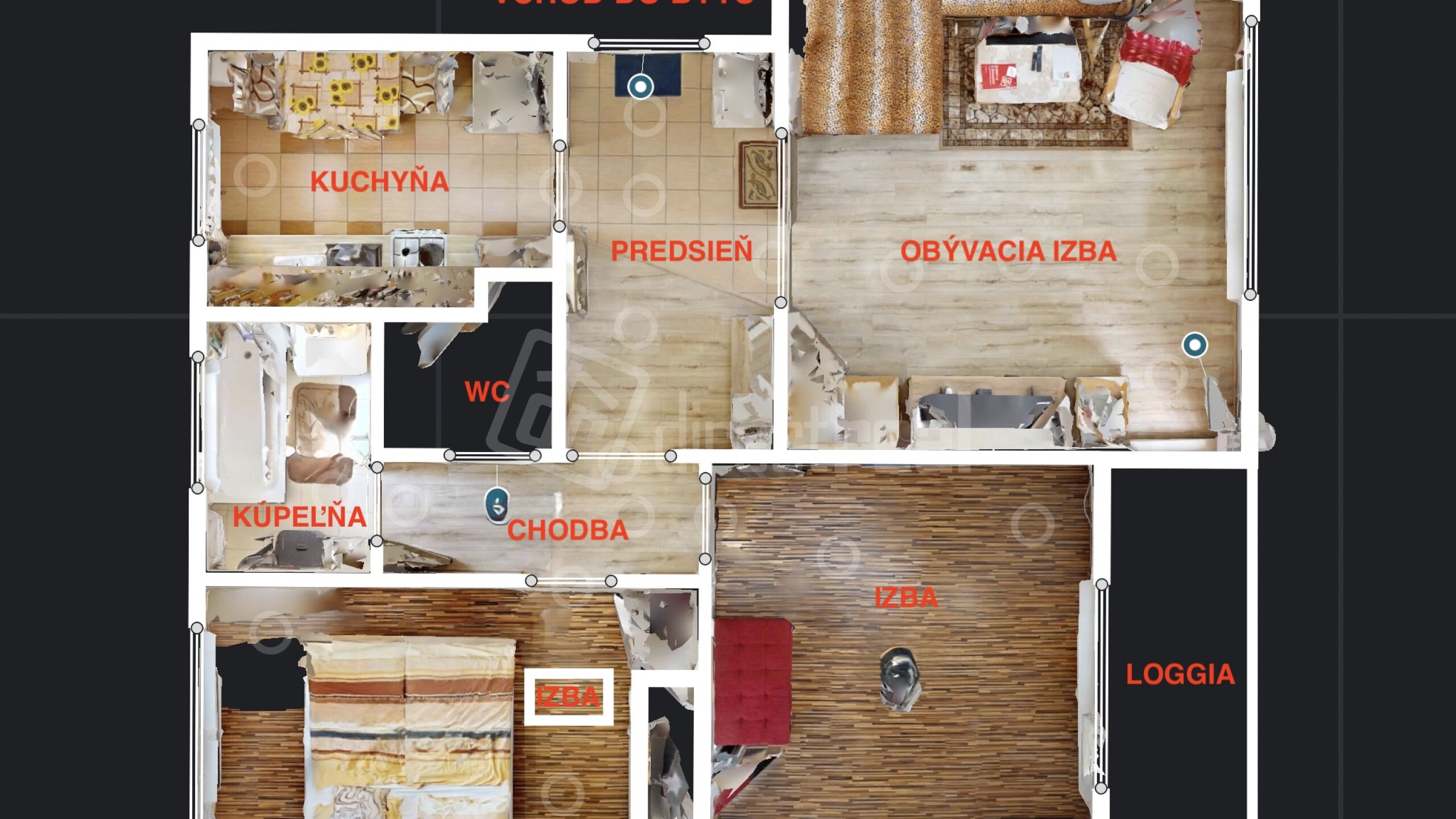 Predsieň, kuchyňa, obývacia izba s výstupom na loggiu, chodba, izba, izba, kúpeľňa s vaňou, samostatná toaleta a k bytu prislúcha pivničný priestor - kobka.