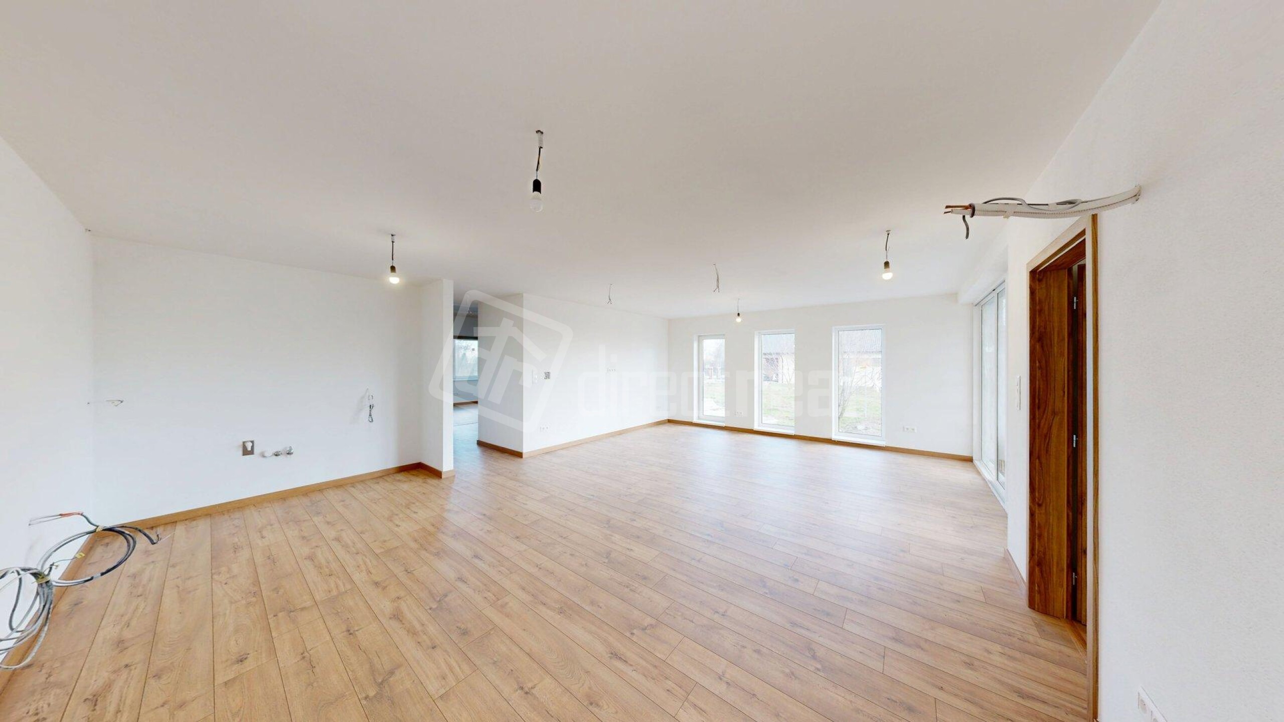 Predsieň, chodba, samostatná toaleta s umývadlom, technická miestnosť, 3x izba, kúpeľňa s vaňou a so sprchovacím kútom + toaleta, obývacia izba prepojená s kuchyňou a s výstupom na terasu, terasa