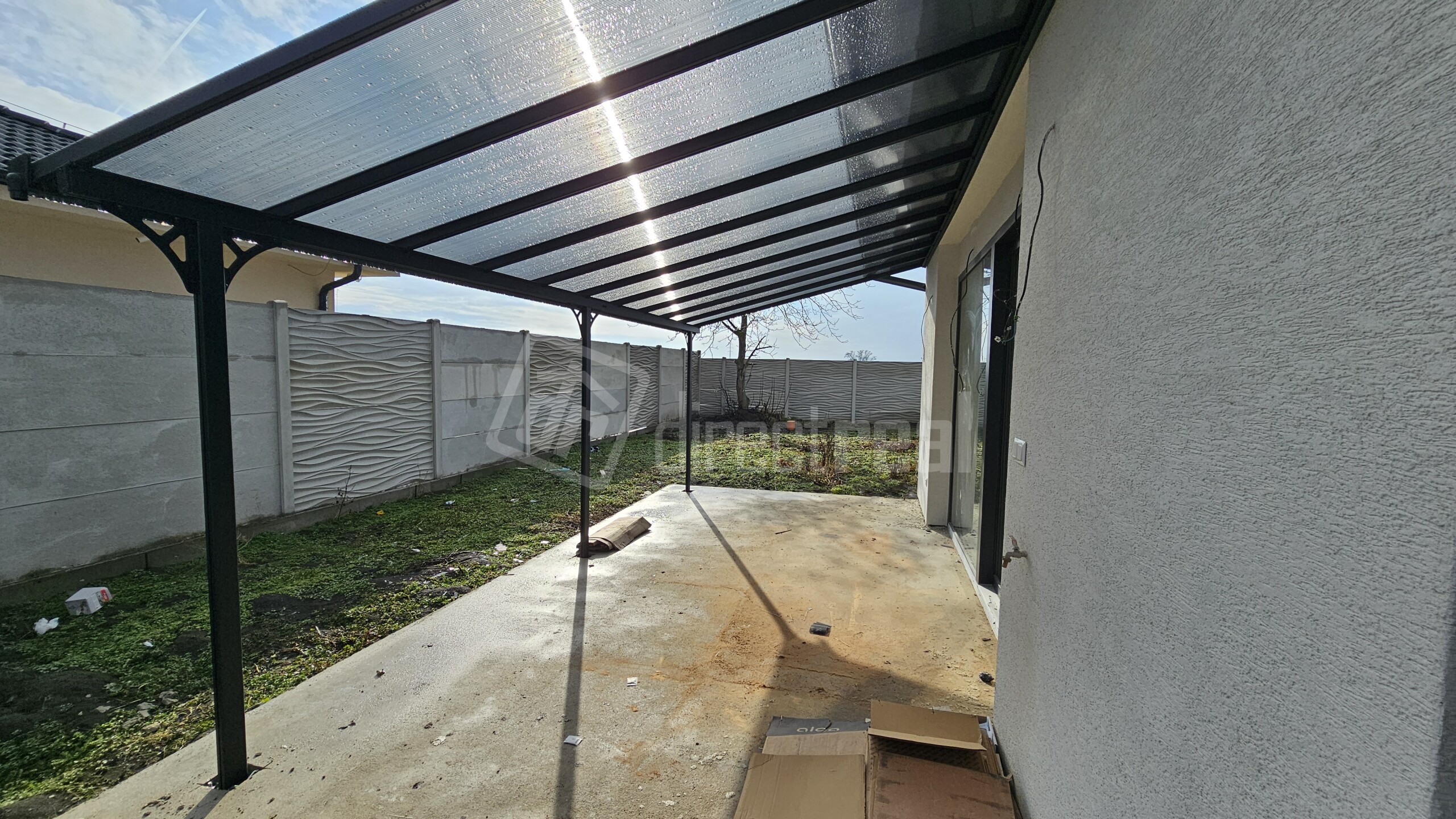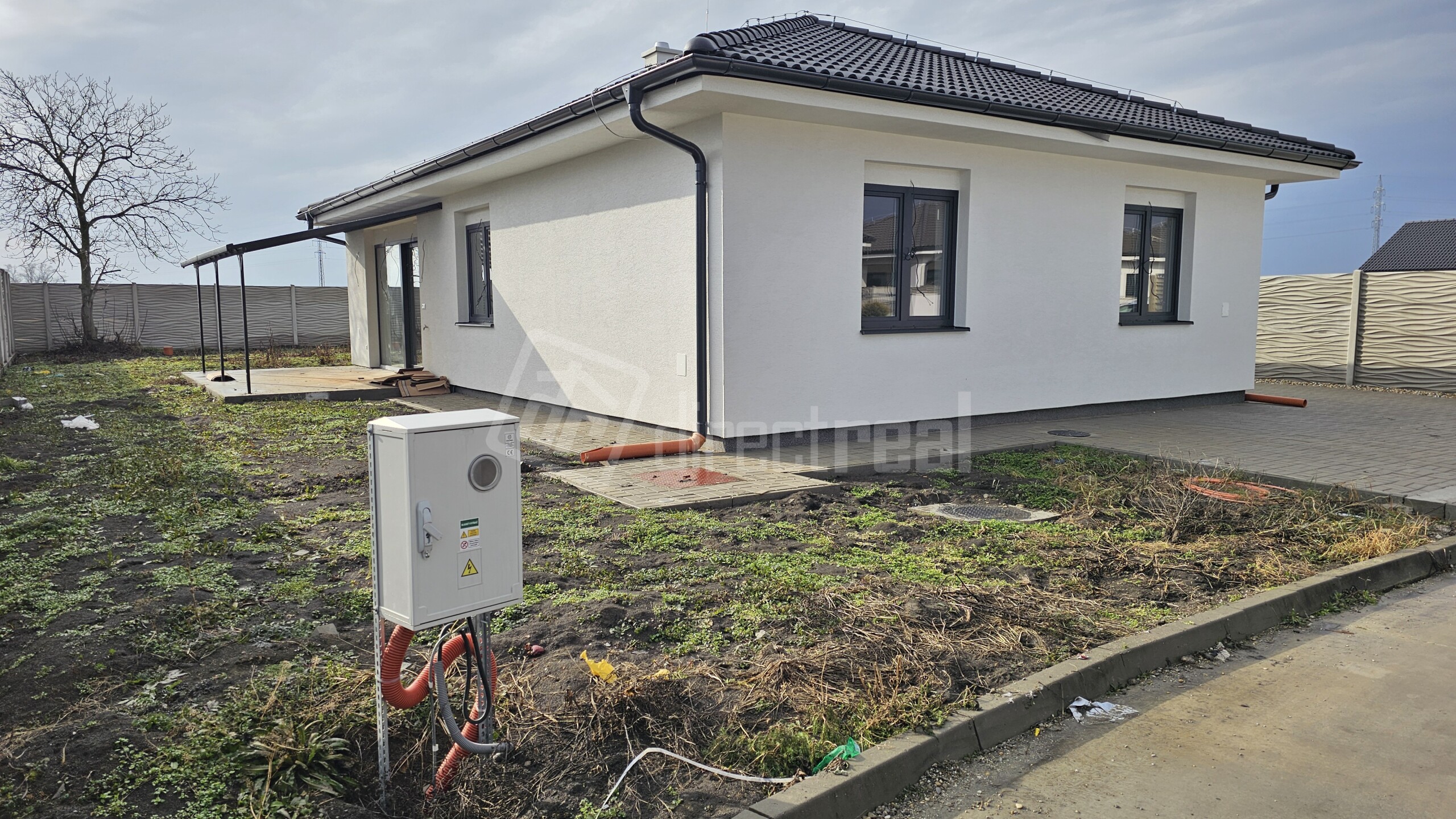 Pozemok je oplotený betónovým plotom, okrem čelnej strany, s parkoviskom pre 3 autá a prekrytou terasou. Na terase bude zhotovená dlažba na podlahe. Energetická trieda A0, stavba je skolaudovaná. Pozemok je vyrovnaný kvalitnou zeminou a na polievanie máte nachystanú vŕtanú studňu.