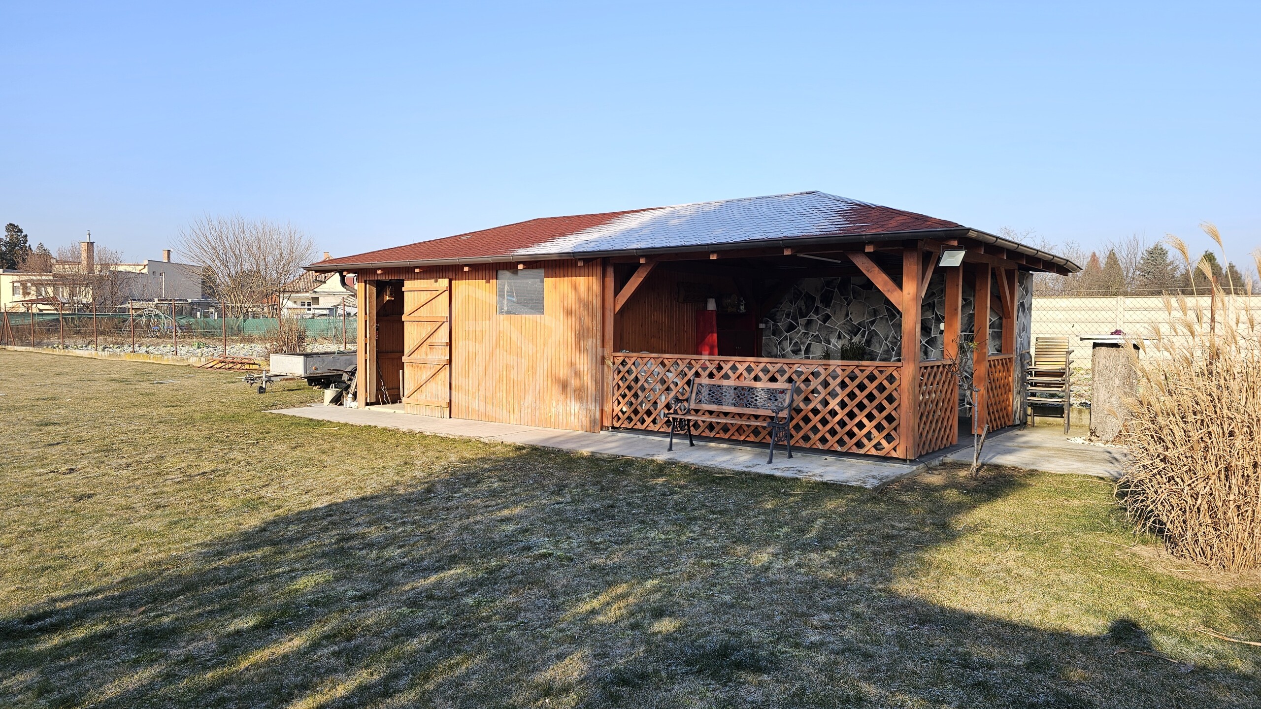 Na pozemku sa nachádza altánok s úložným priestorom na náradie, pivnica na zeleninu a zavlažovací systém napojený na studňu. Pozemok je prakticky rozdelený na oddychovú časť (trávnik vhodný pre deti) a úžitkovú časť na pestovanie ovocia a zeleniny.