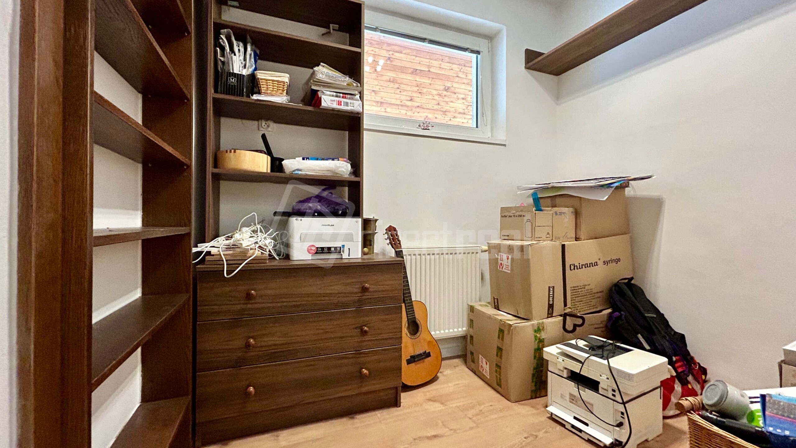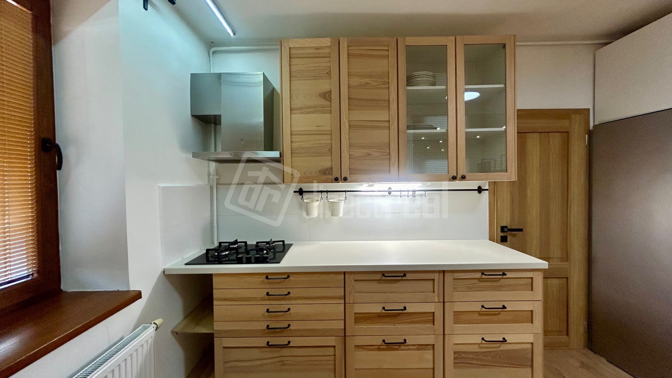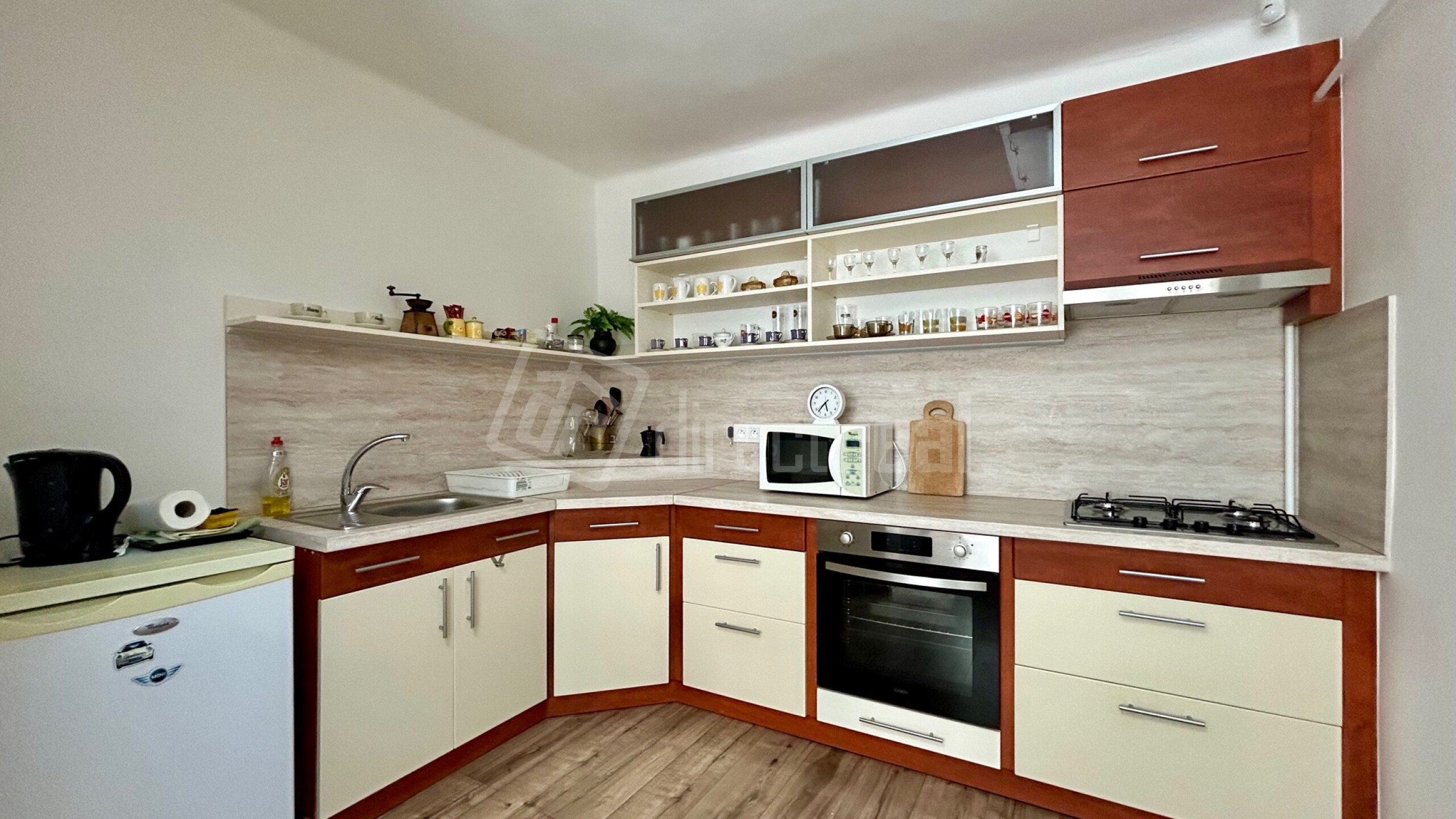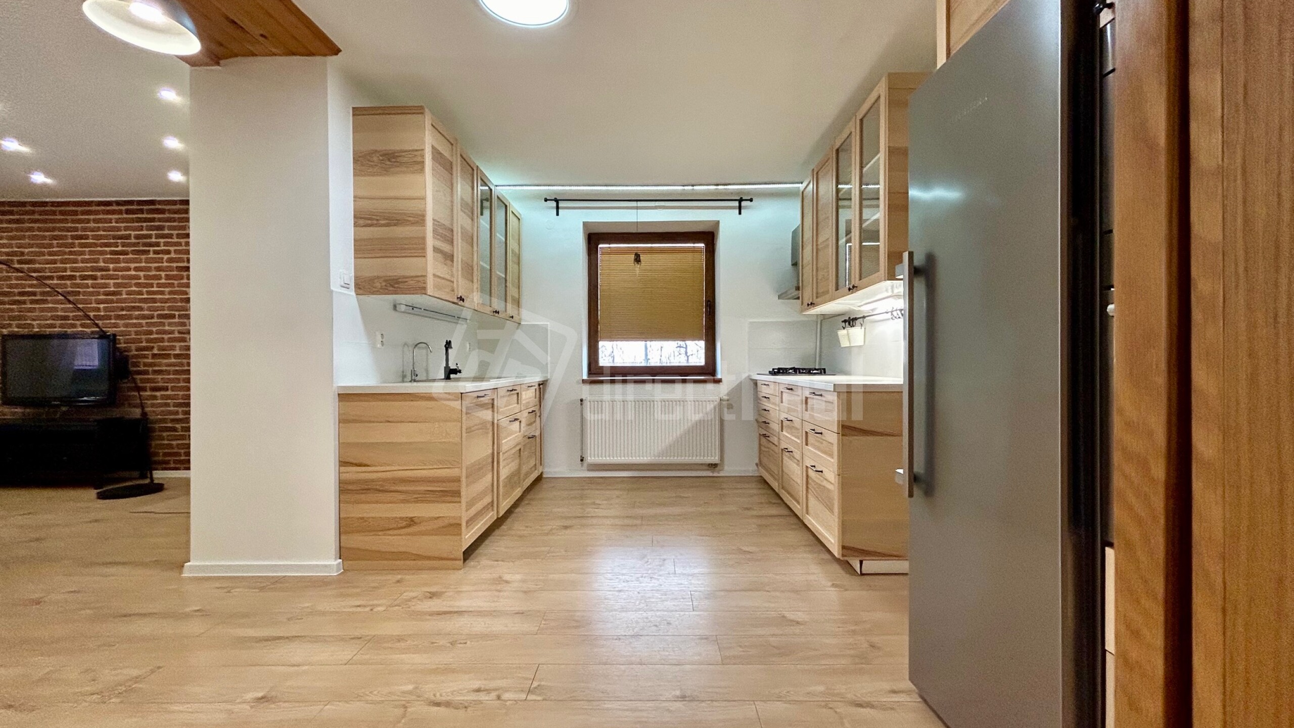 V cene nehnuteľnosti je zahrnutá kuchynská linka v kuchyni so zabudovanými spotrebičmi, sedačka v obývačke, a rôzne skrinky a police.