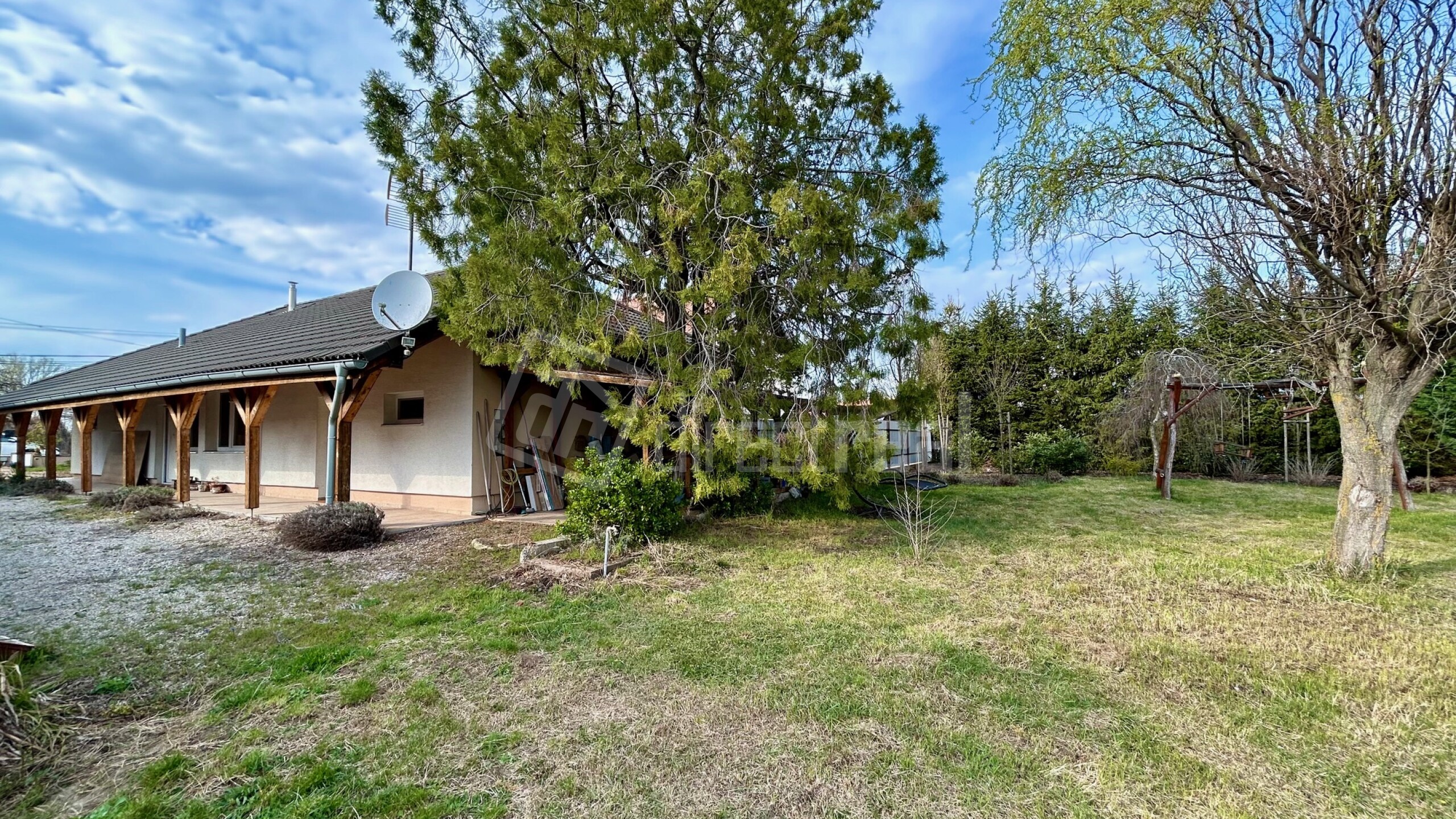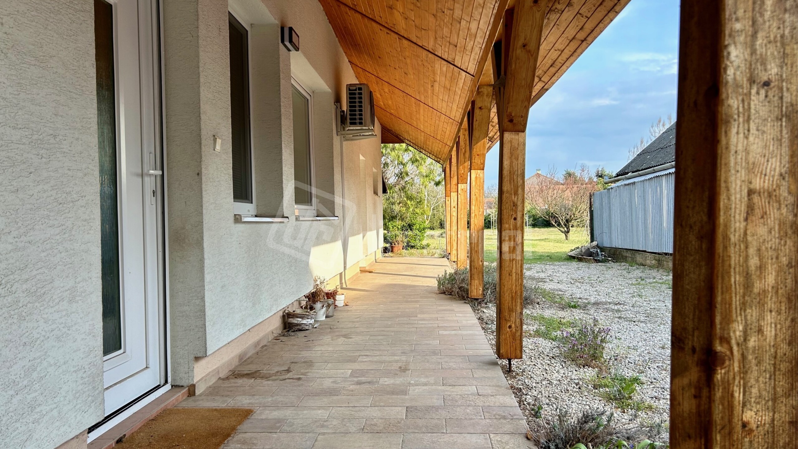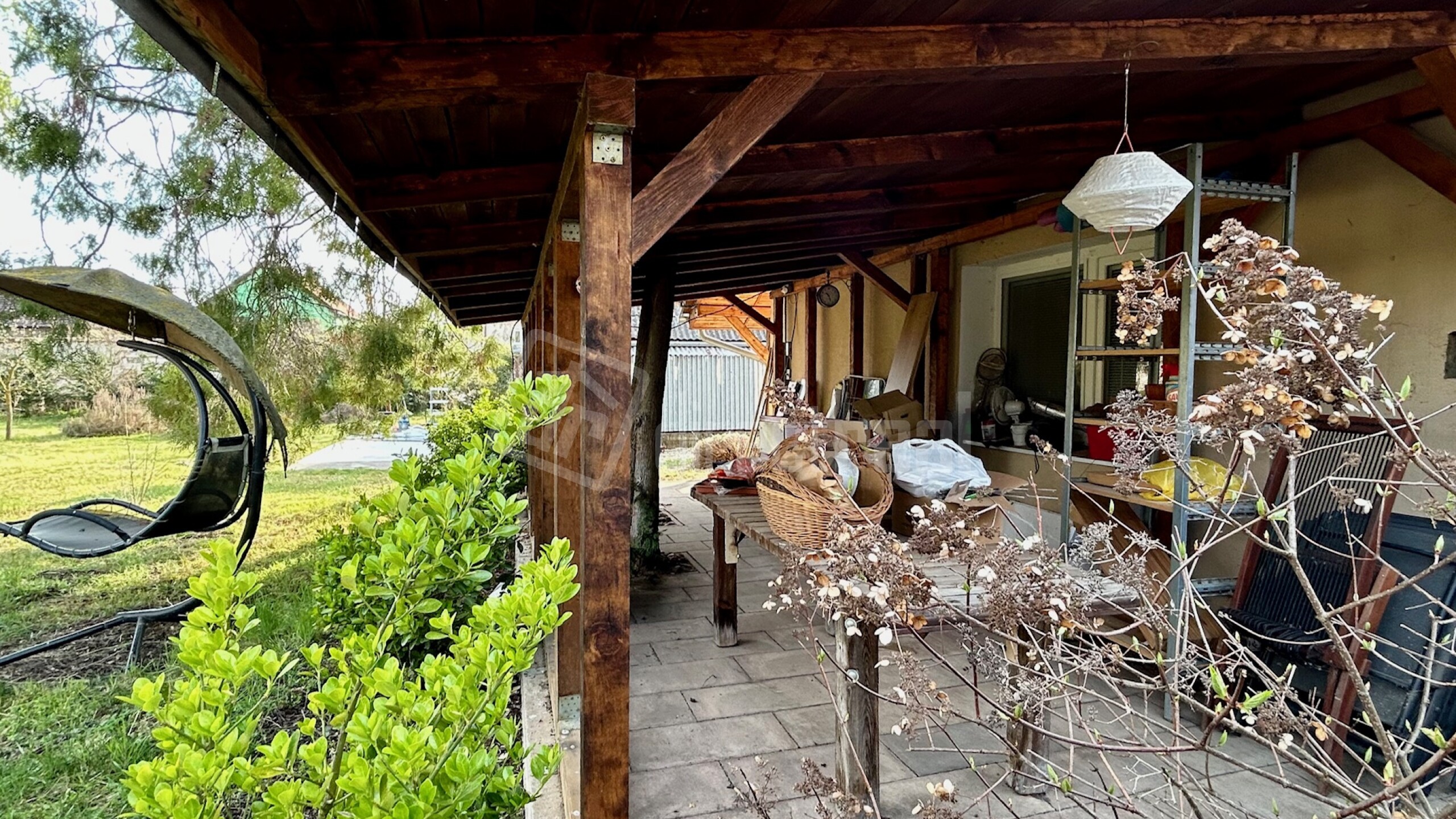 Exteriér ponúka vonkajšiu prekrytú terasu a udržiavaný dvor s veľkou záhradou s automatickým závlahovým systémom, ktorý je možné ovládať cez aplikáciu v mobilnom telefóne. V záhrade sa nachádzajú rôzne ihličnaté a listnaté stromy a drevená hojdačka.