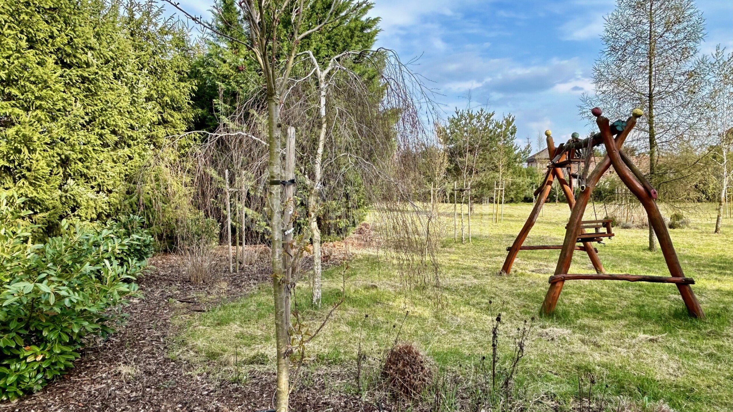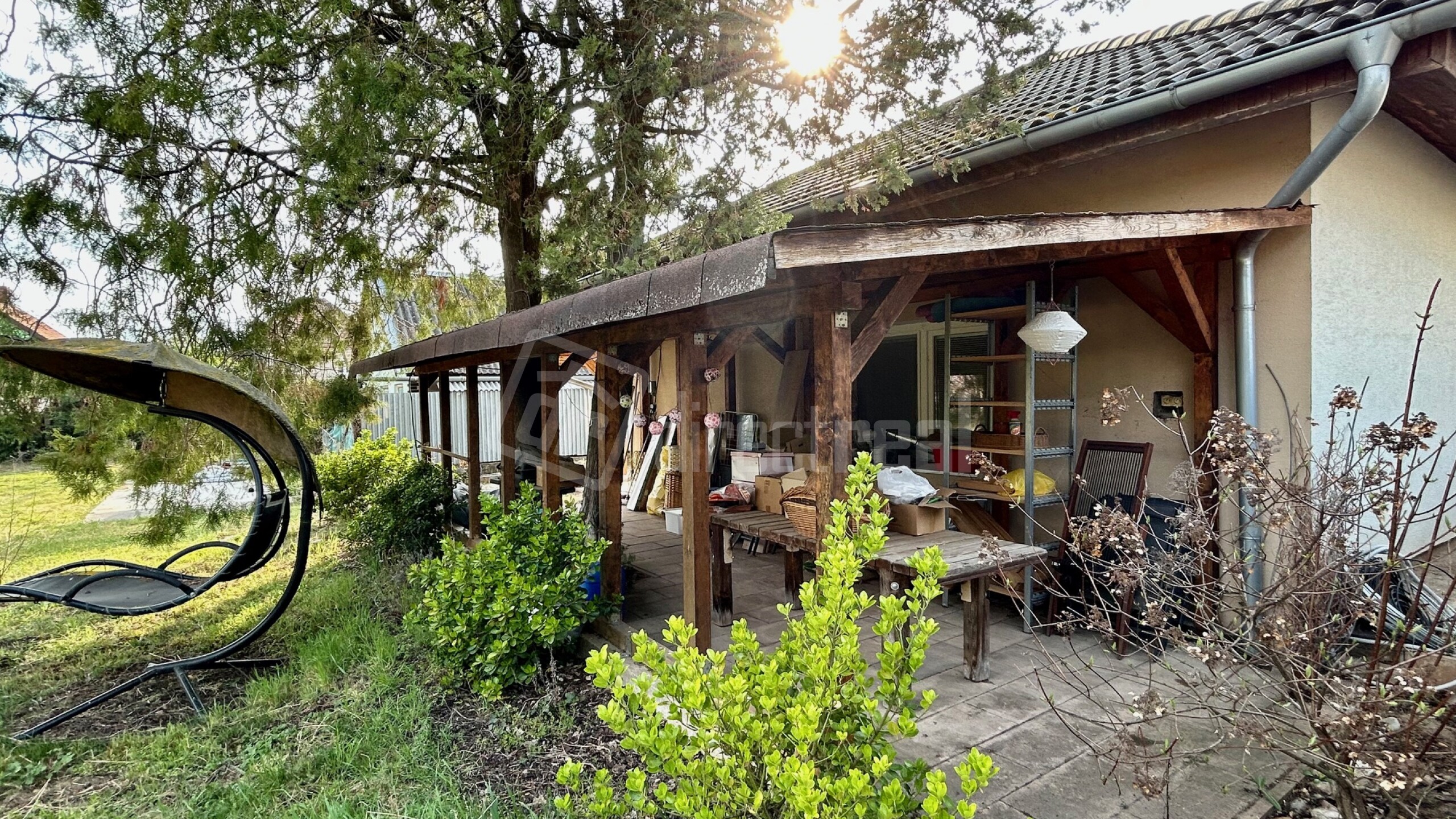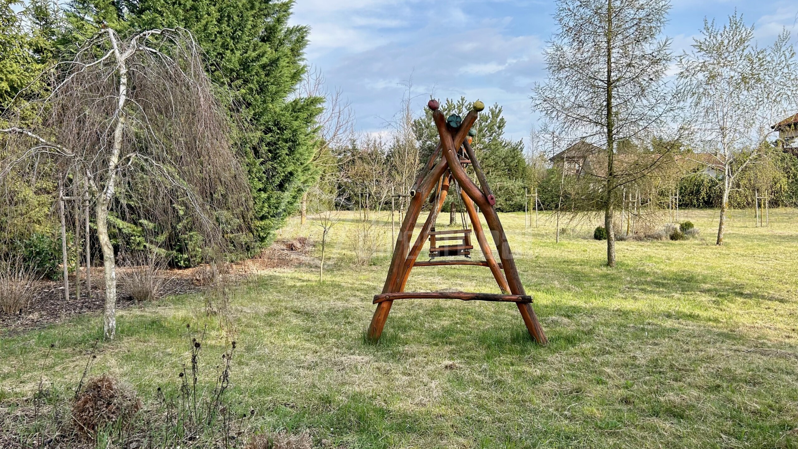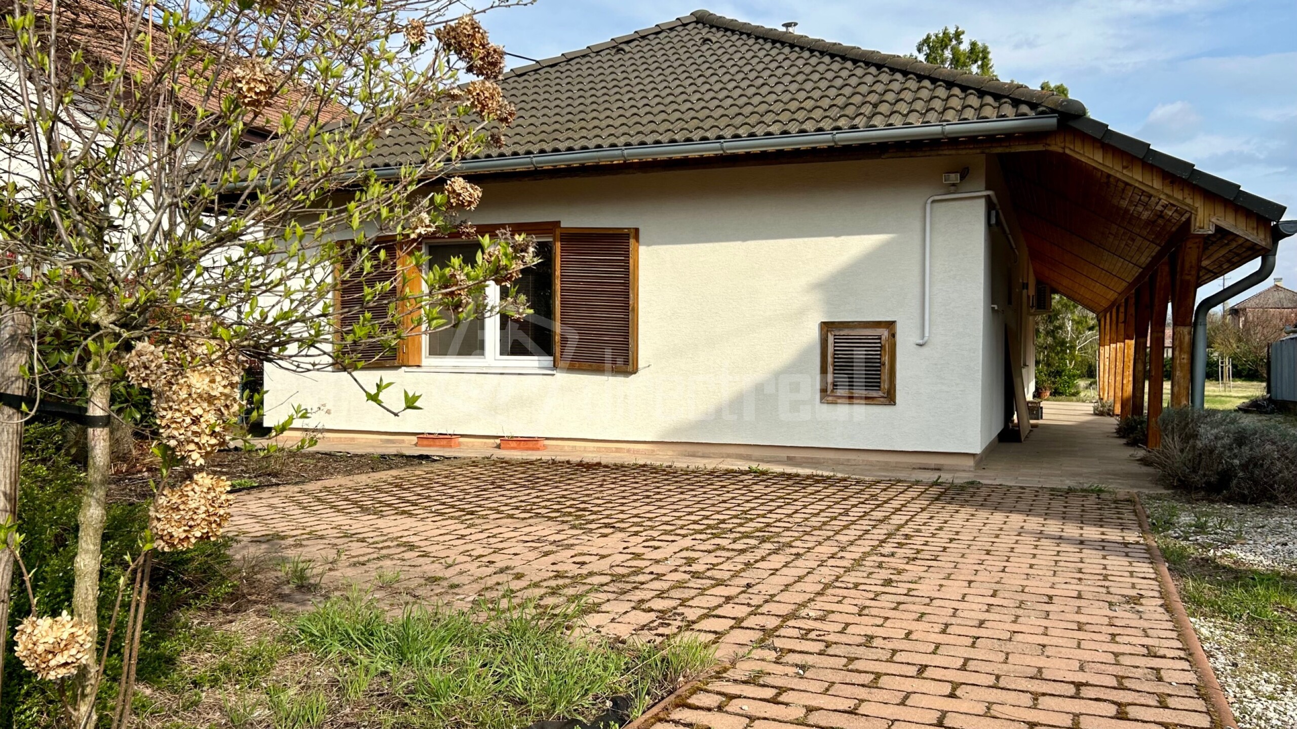 Exteriér ponúka vonkajšiu prekrytú terasu a udržiavaný dvor s veľkou záhradou s automatickým závlahovým systémom, ktorý je možné ovládať cez aplikáciu v mobilnom telefóne. V záhrade sa nachádzajú rôzne ihličnaté a listnaté stromy a drevená hojdačka.