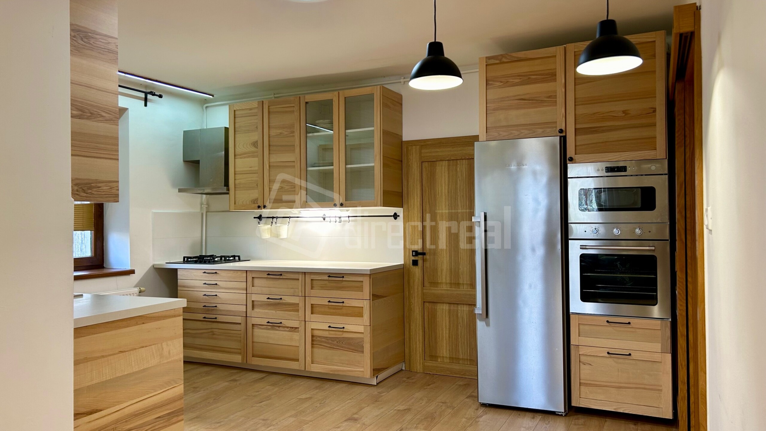 V kuchyni je štýlová kuchynská linka vyrobená na mieru so zabudovanými spotrebičmi, a to plynový sporákom, elektrickou rúrou, chladničkou, mikrovlnnou rúrou a digestorom.