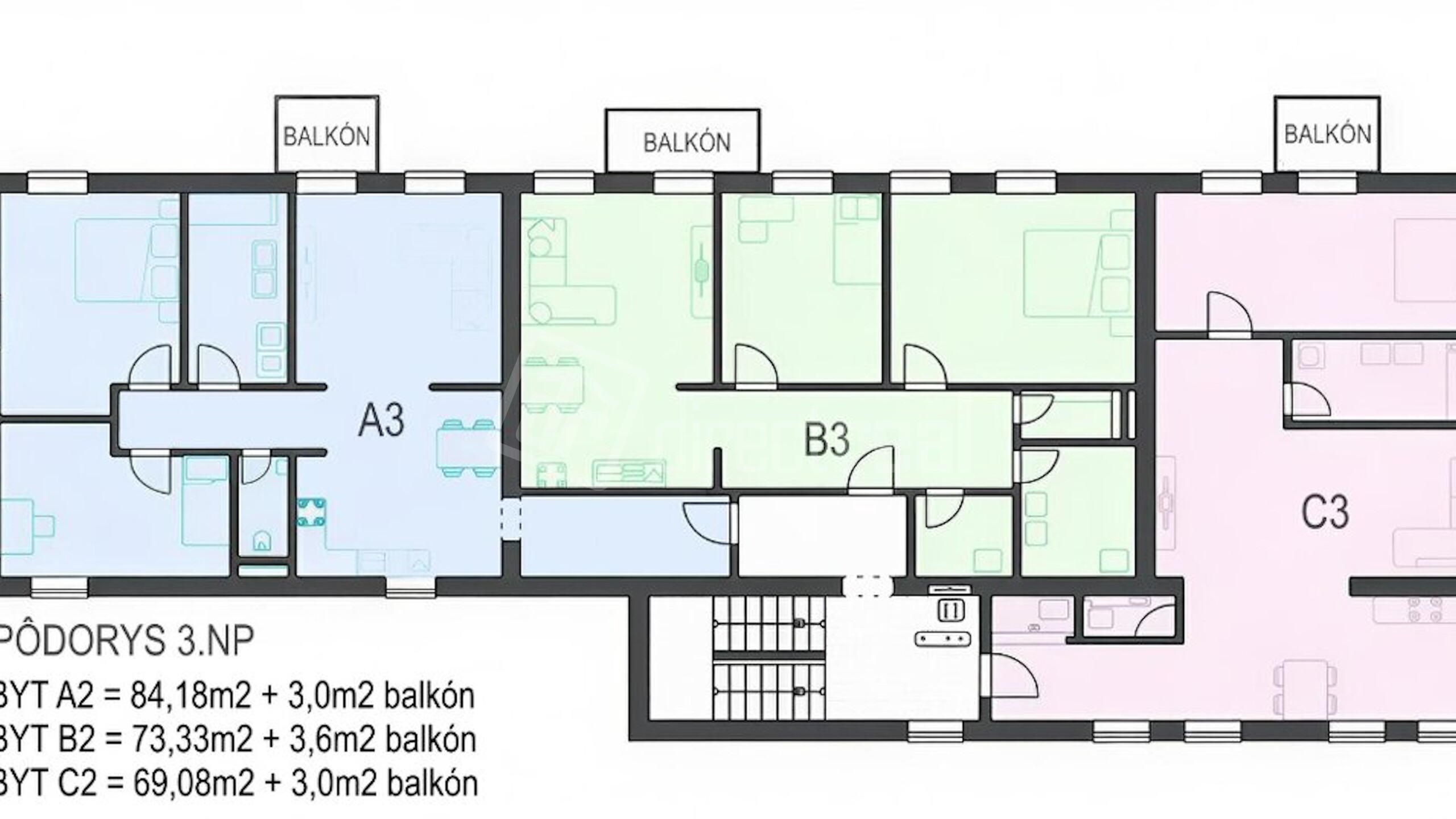 Byt A3( 3.izb.) — 84,18 m² + 3m2 balkón + 2,7m2 kobka = 278 628€