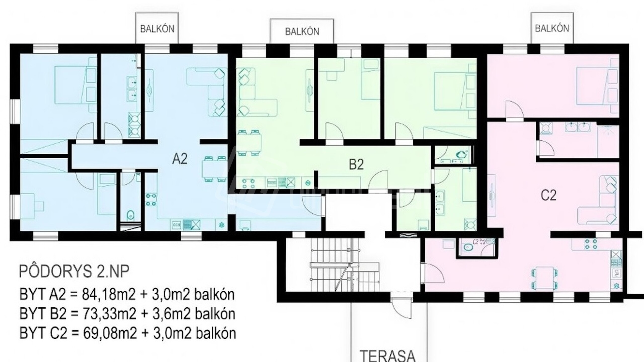 Byt C2 ( 2.izb. )— 69,08 m² + 3m2 balkón + 2,7m2 kobka = 231 818€