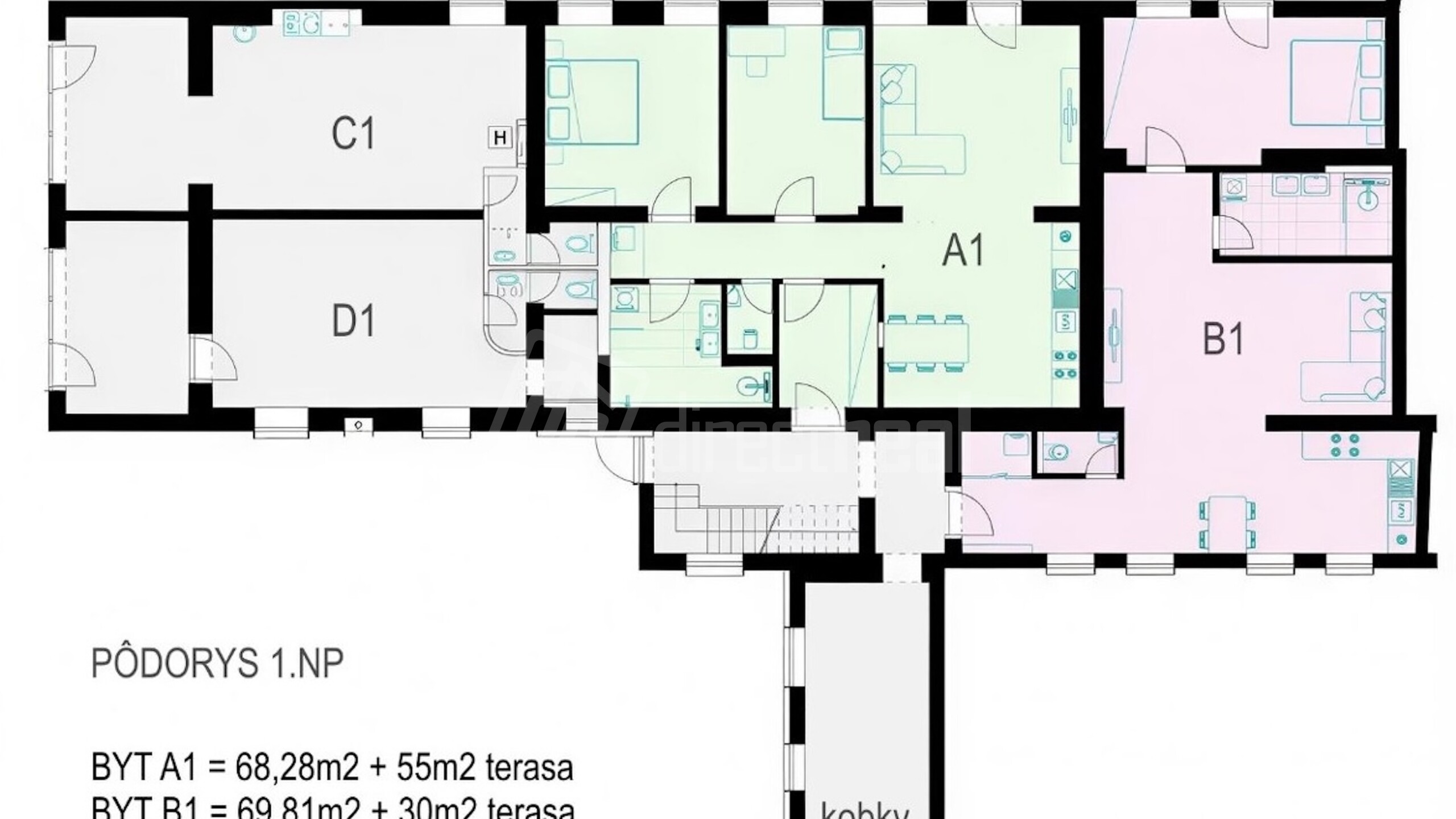 Byt B1( 2.izb.) — 69,81 m² + 30m2 terasa + 2,7m2 kobka = 235 781 €