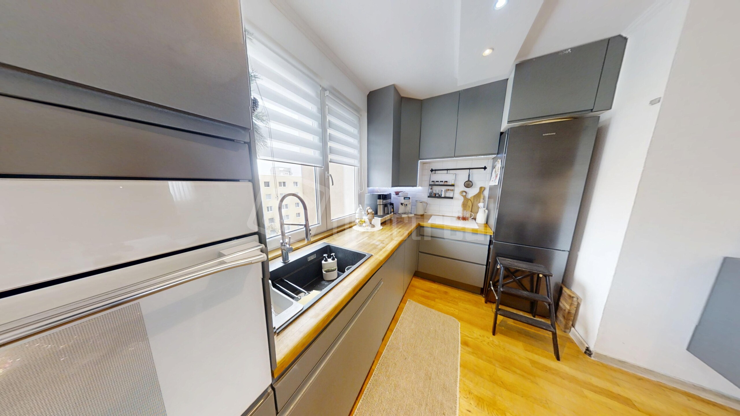 Byt prešiel úplnou zmenou dispozície a je po kompletnej rekonštrukcii. Pôvodne 4izbový byt, bol prerobený na 3izbový s veľkou kúpeľnou - rohovou vaňou, zároven aj sprchovým kútom a vlastným šatníkom. V byte bola menená komplet elektrika, všetky rozvody, plastové okná, podlahy - drevené dubové parkety, klimatizácia(7.5kw) - kompresor s umiestnením na strechu, na mieru stavaná kuchynská linka so zabudovanými spotrebyčmi. Kúpeľňa(sprcha + rohová vaňa) a samostatné WC sú po rekonštrukcii. Súčasťou bytu je priestranná loggia a samozrejme vlastná pivnica.