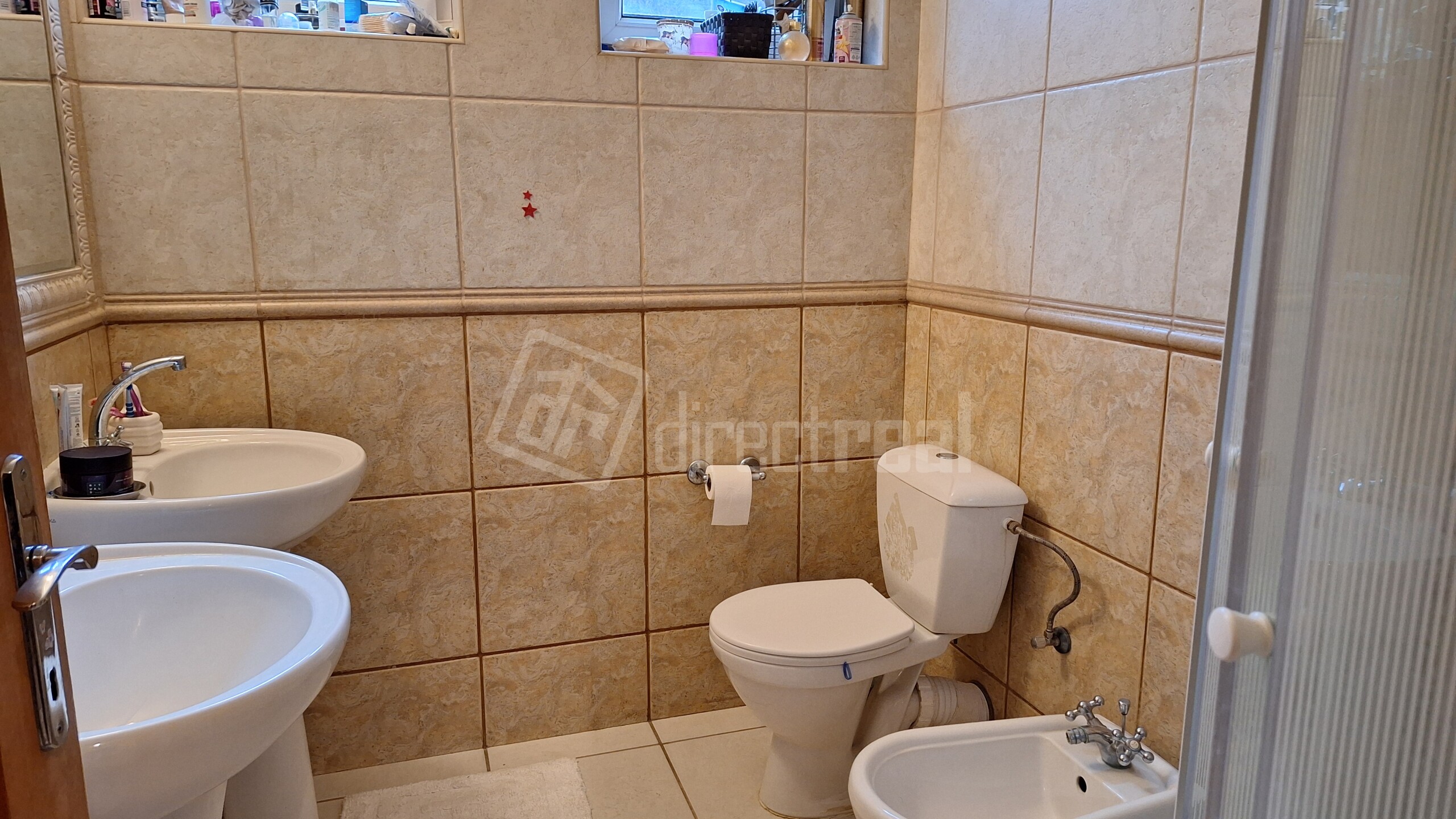 Vedľa izby sú dvere do kúpeľne s dvoma umývadlami, novým sprchovacím kútom, bidetom a WC.