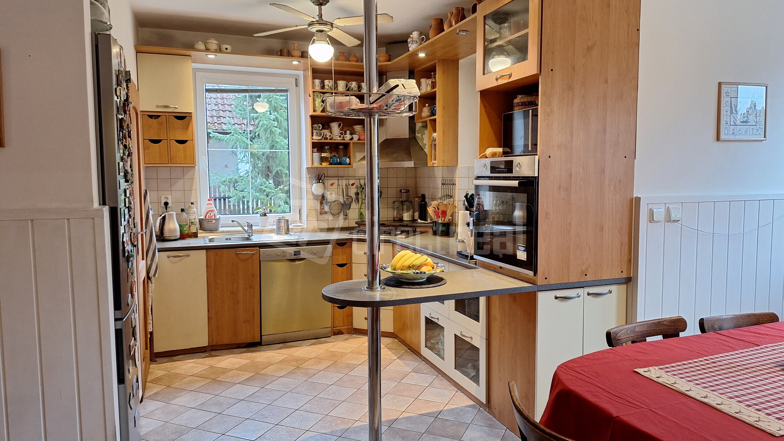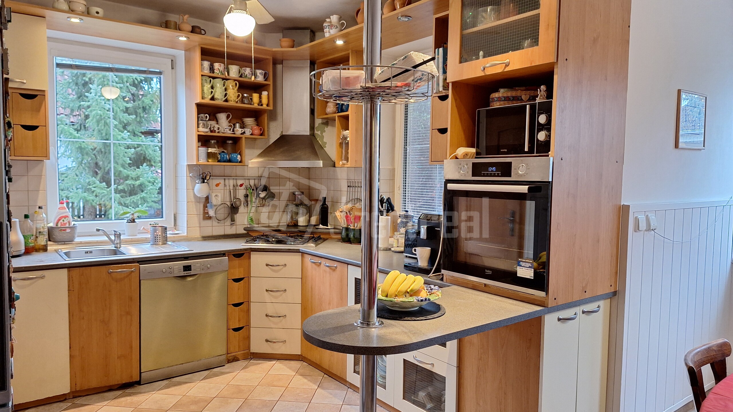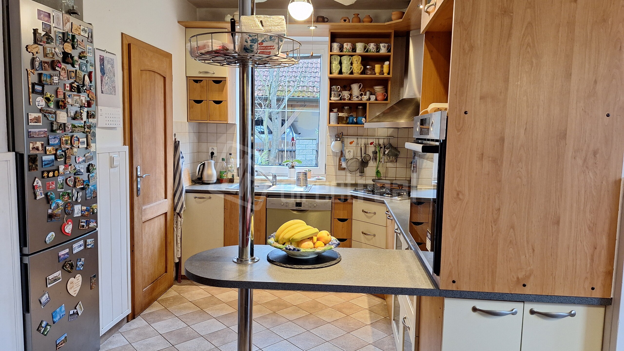 Kuchynská linka je do tvaru písmena "U" so zabudovanou 5-roč. umývačkou riadu zn. BOSCH a 2-roč. elektrickým sporákom zn. BEKO a plynovou varnou doskou. Z kuchyne sú dvere do špajze.