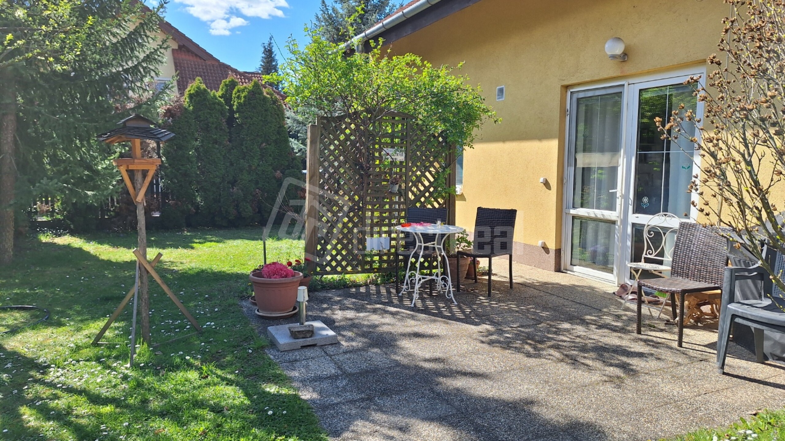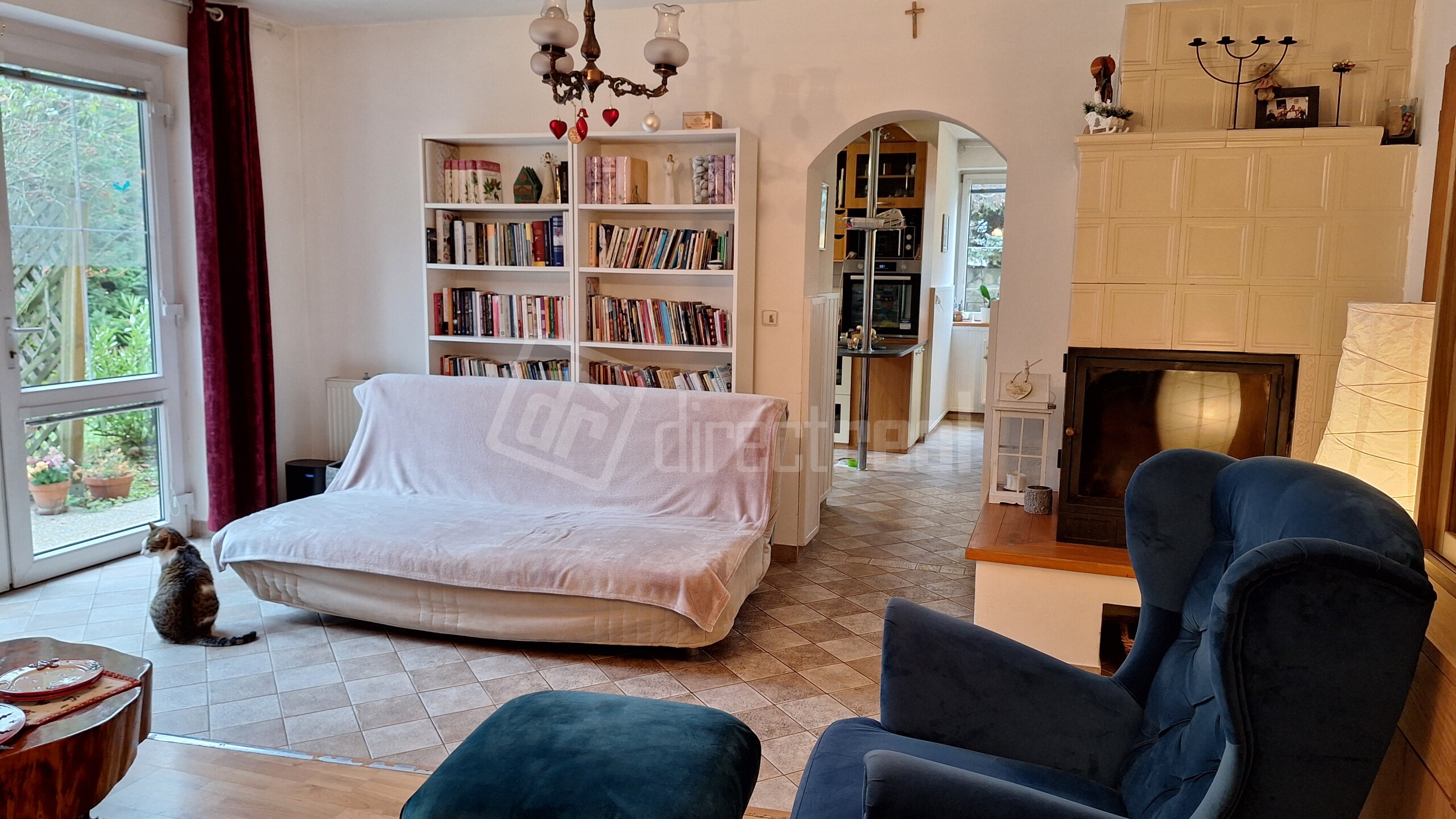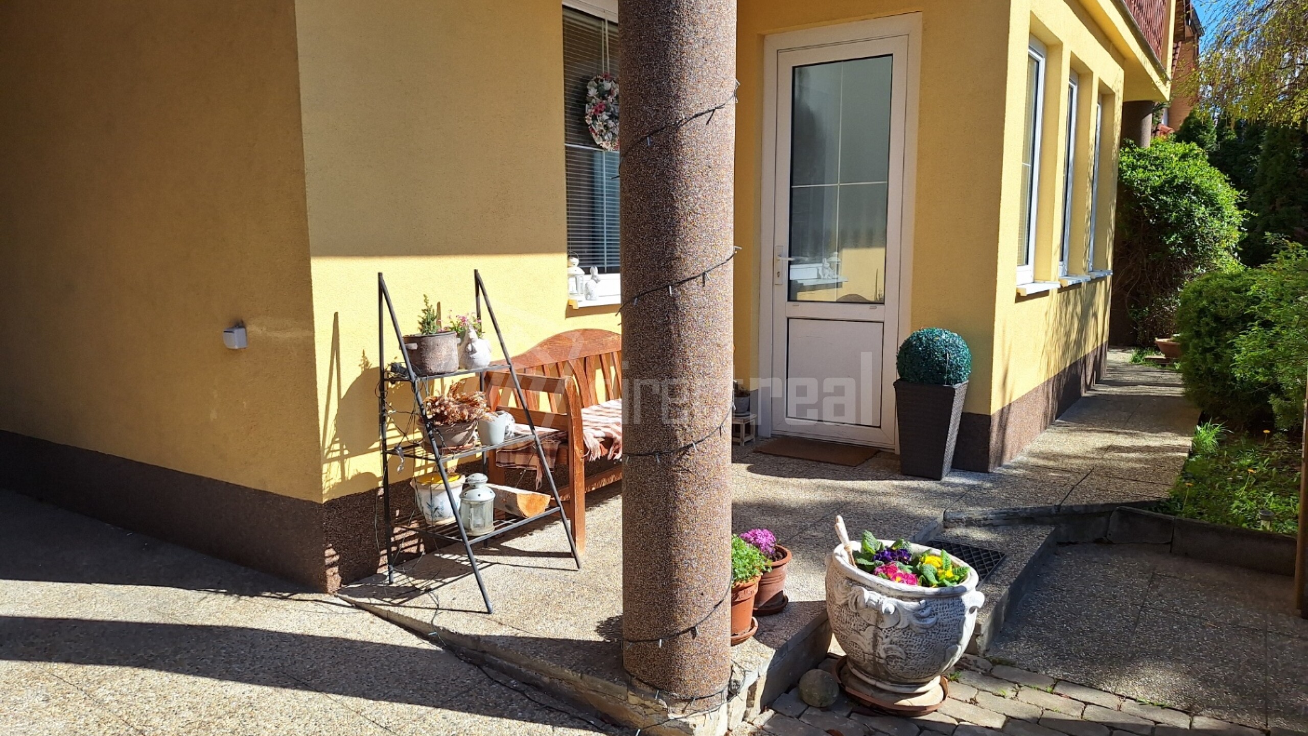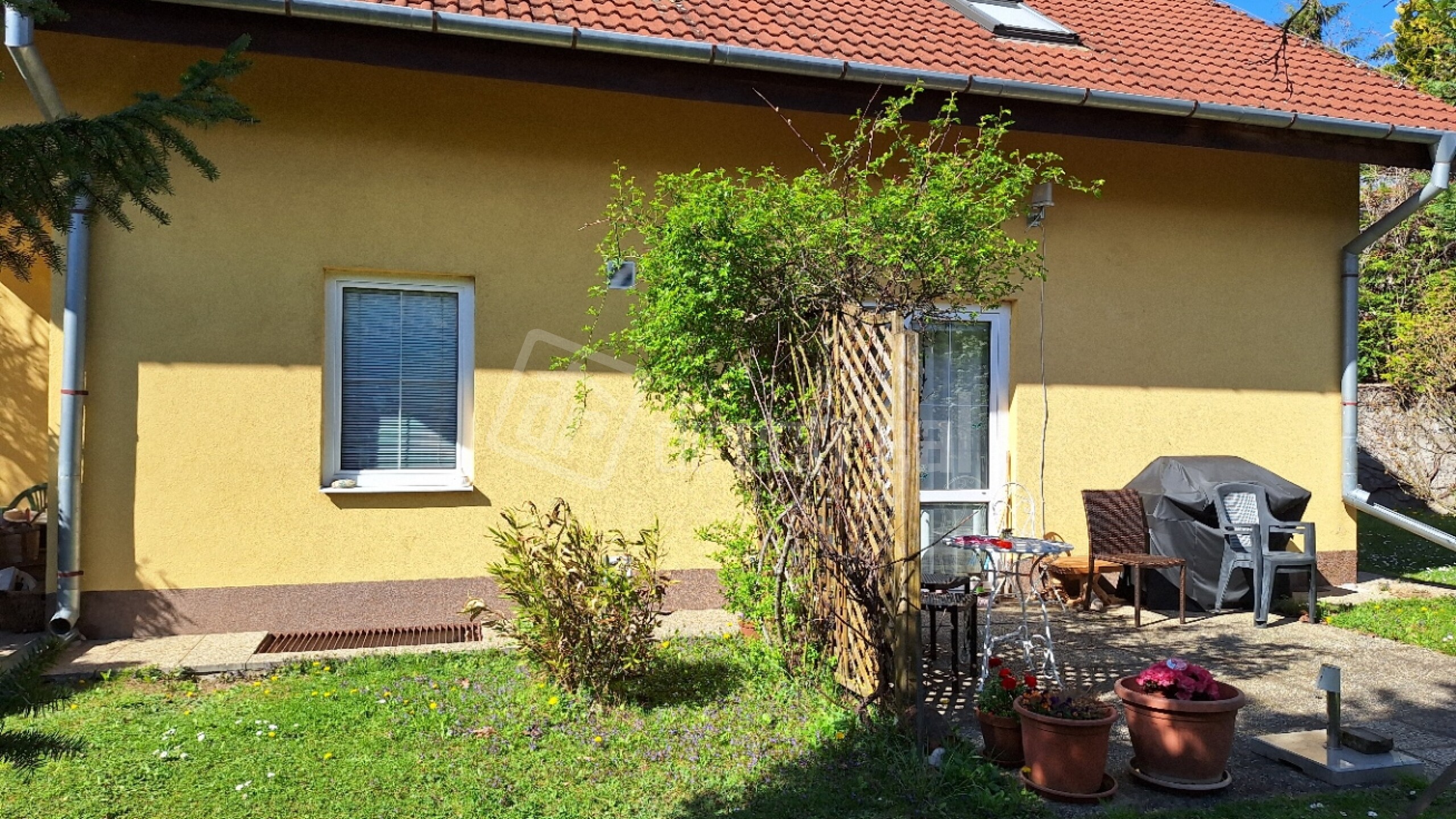 Z obývačky sú dvojkrídlové dvere na terasu, ktorá je orientovaná na južnú stranu domu a jedno okno z obývačky je na východ.