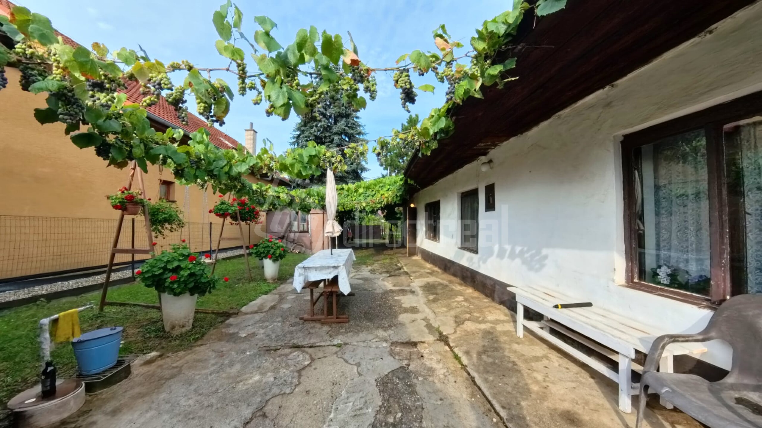 Pozemok je krásne udržiavaný – nájdete tu ovocné stromy, kríky, vinič aj priestor pre záhradkárčenie či oddych.
