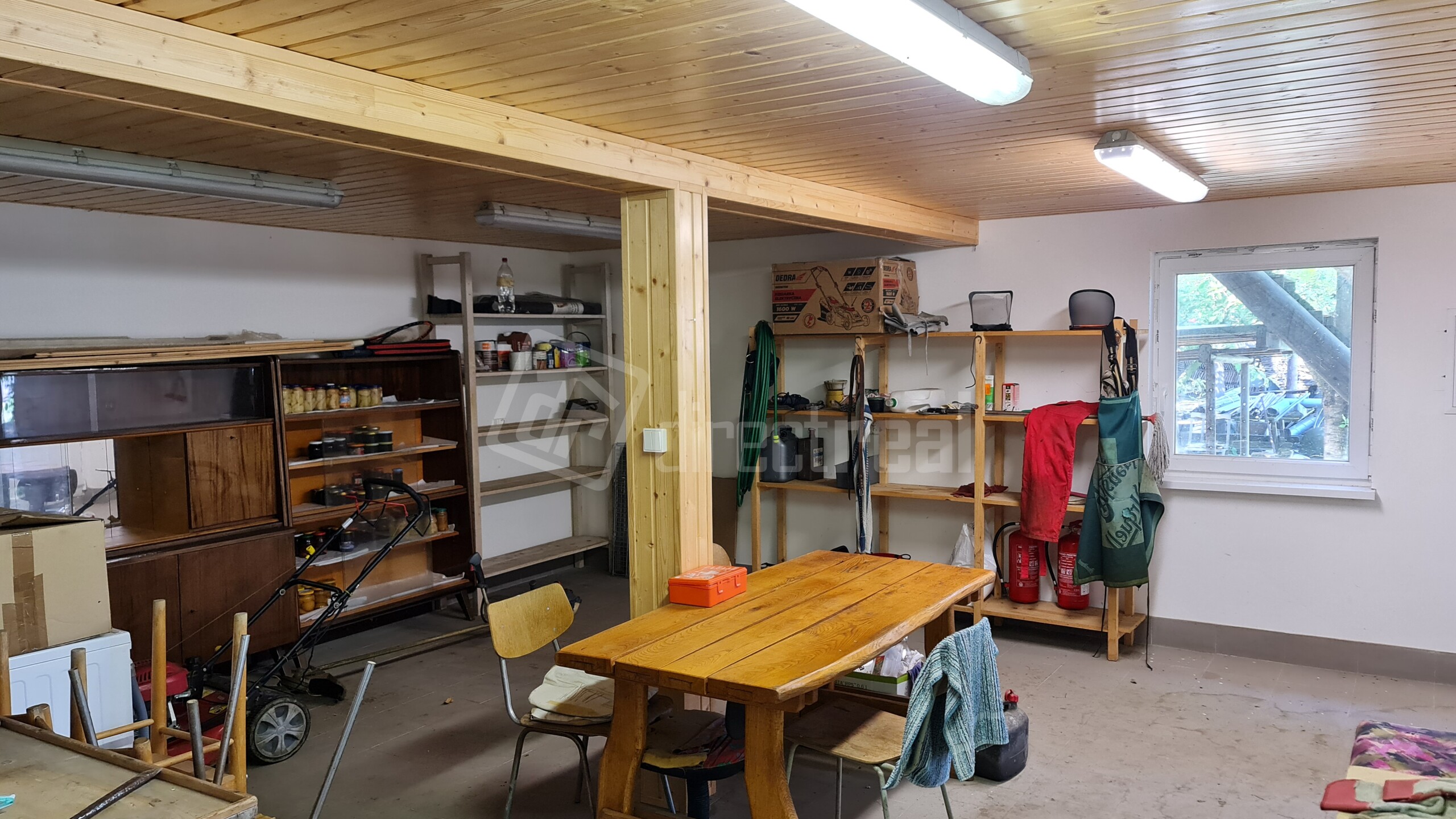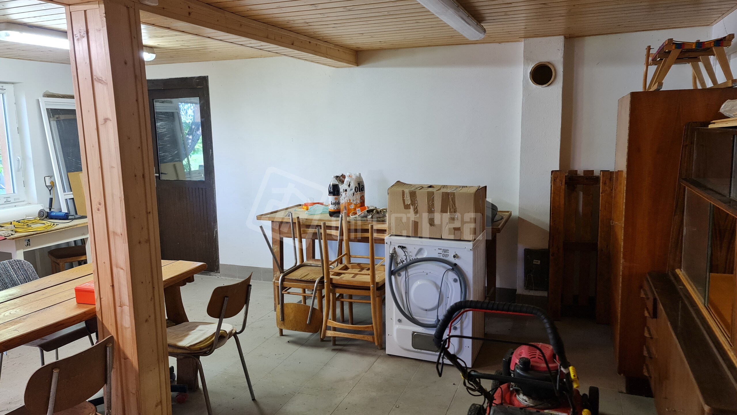 Spoločenská miestnosť, kuchyňa, toaleta s umývadlom, technická miestnosť kde je umiestnená studňa, ohrievač vody a elektrický kotoľ.