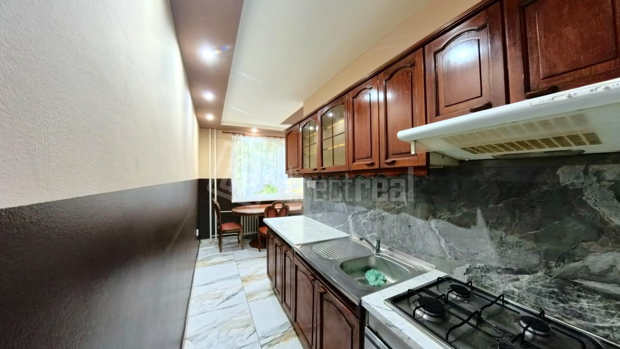 Byt je zariadený masívnym nábytkom, ktorý ponúka dostatok úložného priestoru a praktické využitie v každodennom živote.