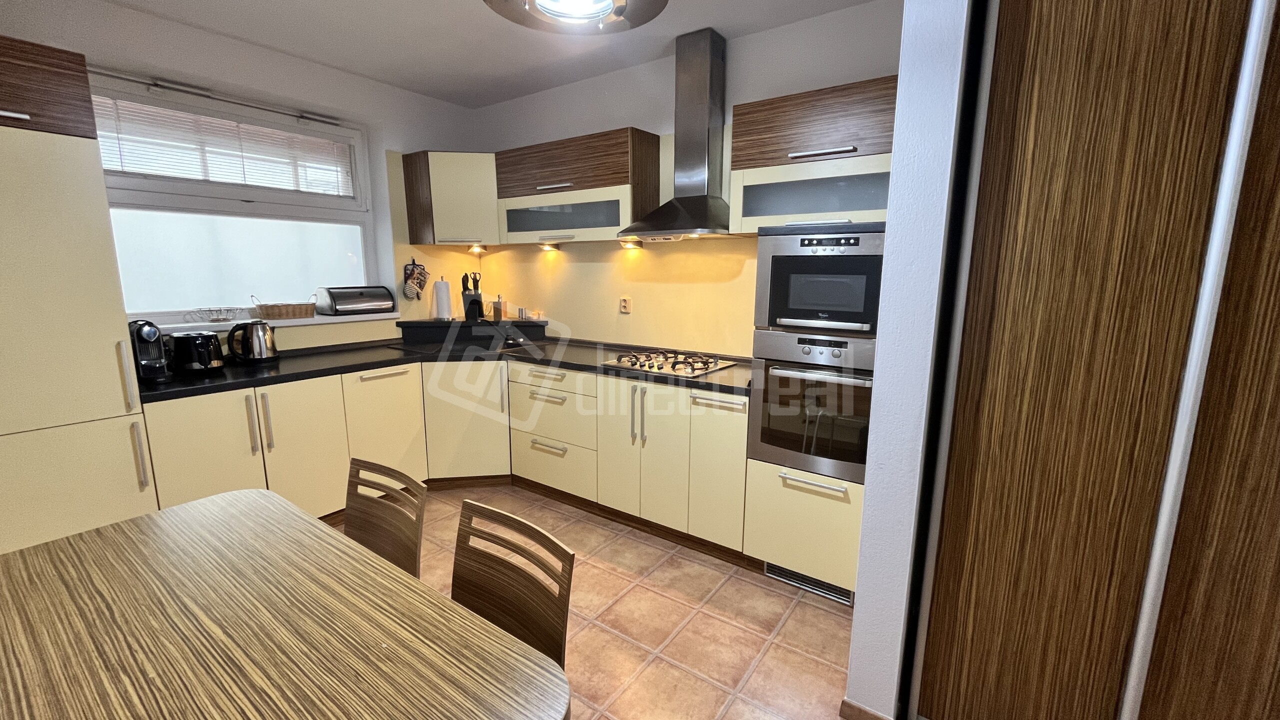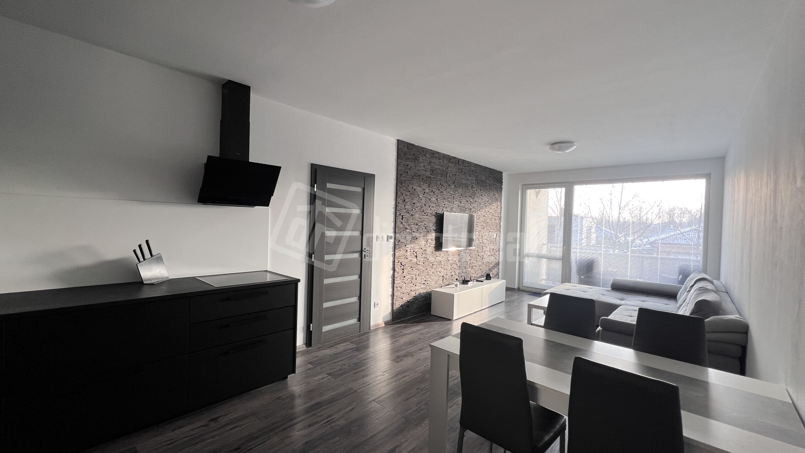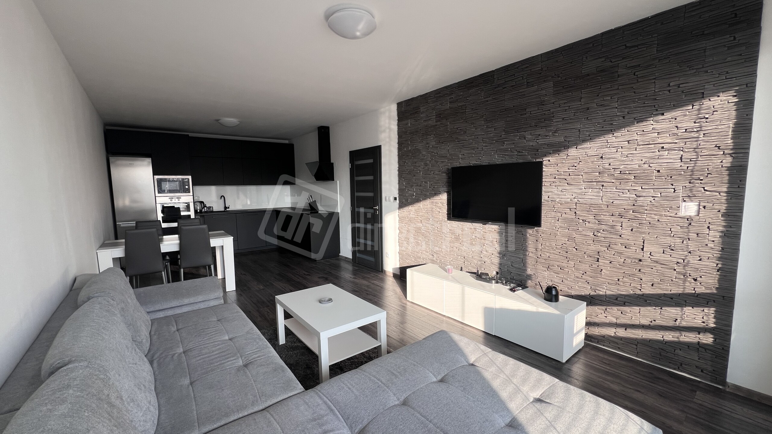 Veľkoryso riešená kuchynská linka na mieru je zariadená vstavanými spotrebičmi ako sú: chladnička s mrazničkou, umývačka riadu, elektrická rúra, elektrická varná doska, digestor. Kuchyňa je kompletne vybavená riadom. Súčasťou kuchyne je stôl so 4. stoličkami. Obývacia časť je zariadená sedacou súpravou, nábytkom a TV. V spálni je dvoj lôžko s úložným priestorom. V byte je samostatný šatník s policami. Elektrické podlahové kúrenie, vlastný zásobník na vodu a práčka. Okná majú žalúzie. K bytu patrí parkovacie státie, ktoré je zabezpečené rampou s diaľkovým ovládaním.