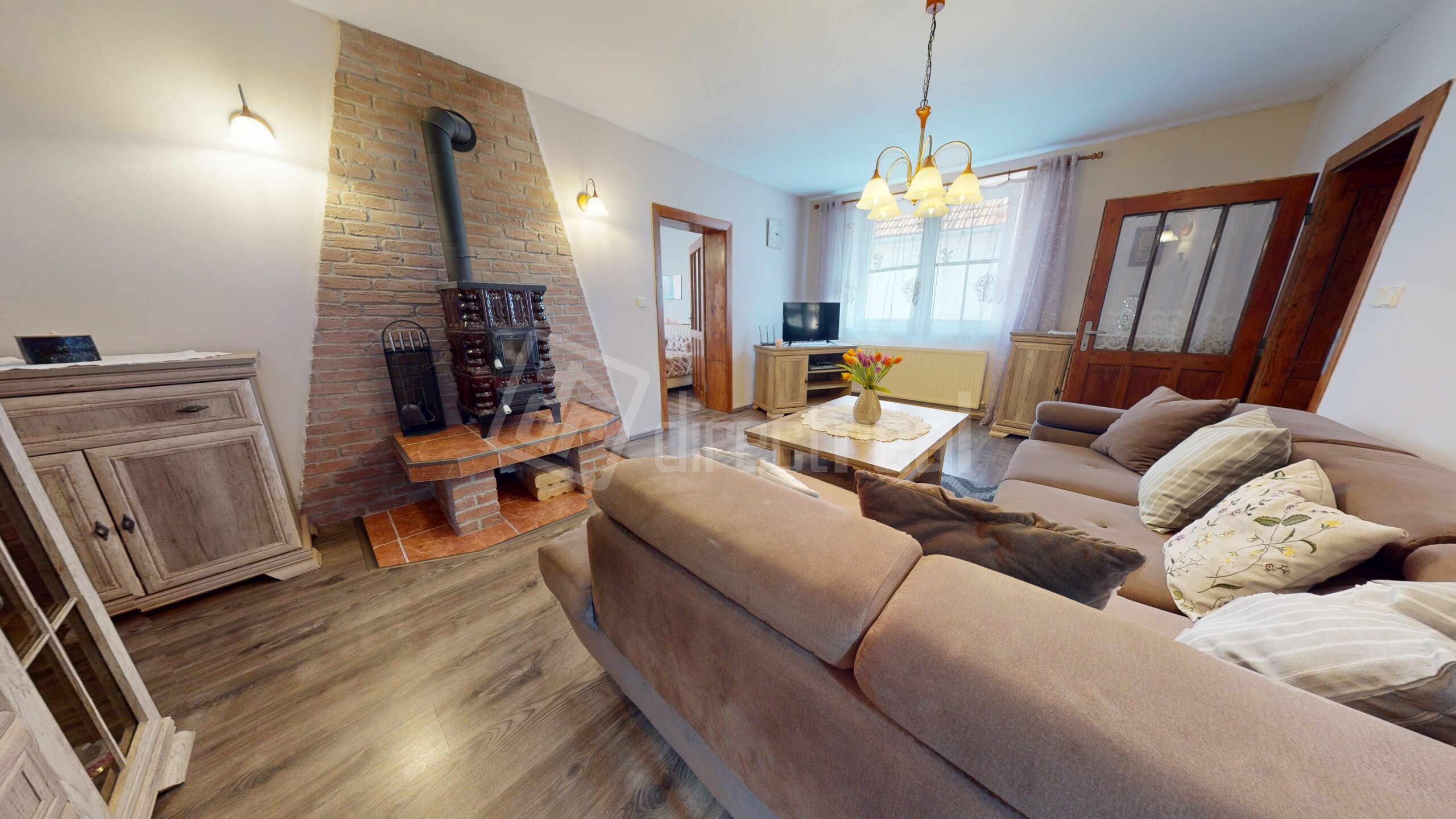 Kúrenie je v dome plynovým kotlom a radiátormi, dokurovanie možné aj cez plne funkčný krb v obývacej miestnosti. Okná sú drevené, vo výbornom stave s vonkajšími žalúziami.